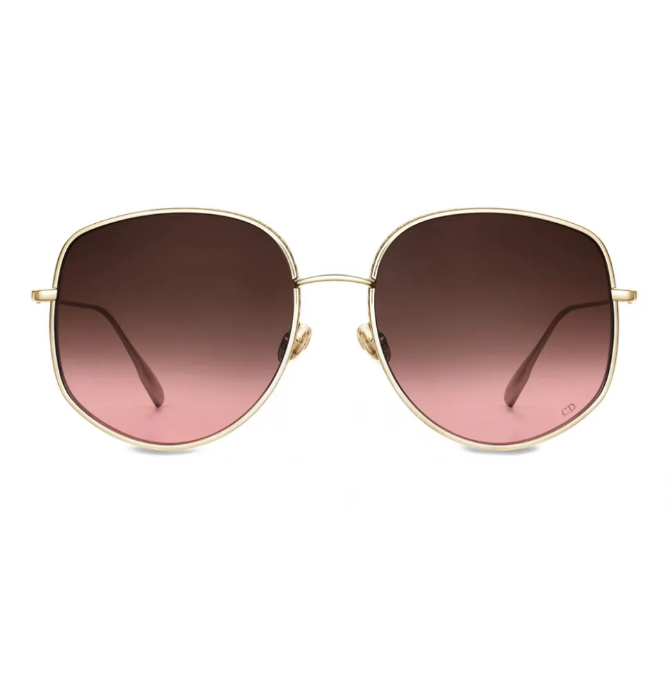The feminine DiorByDior2 sunglasses with their rounded shape are adorned with the emblematic Cannage pattern of the House. The delicate openwork light gold metal frame recalls the refined embroidery from the ready-to-wear collections. Brown to pink shaded lenses add depth to the style.