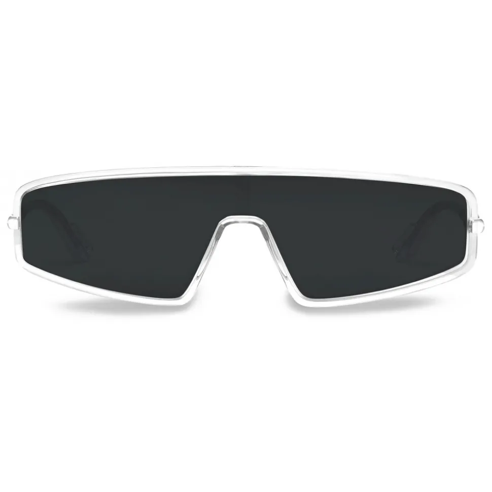 DiorMercure sunglasses from the Pre-Fall 2019 fashion show. The crystal frame highlights the futuristic shape of the gray mask. Slim temples embellished with a black spring-effect insert add a technical touch to the piece.