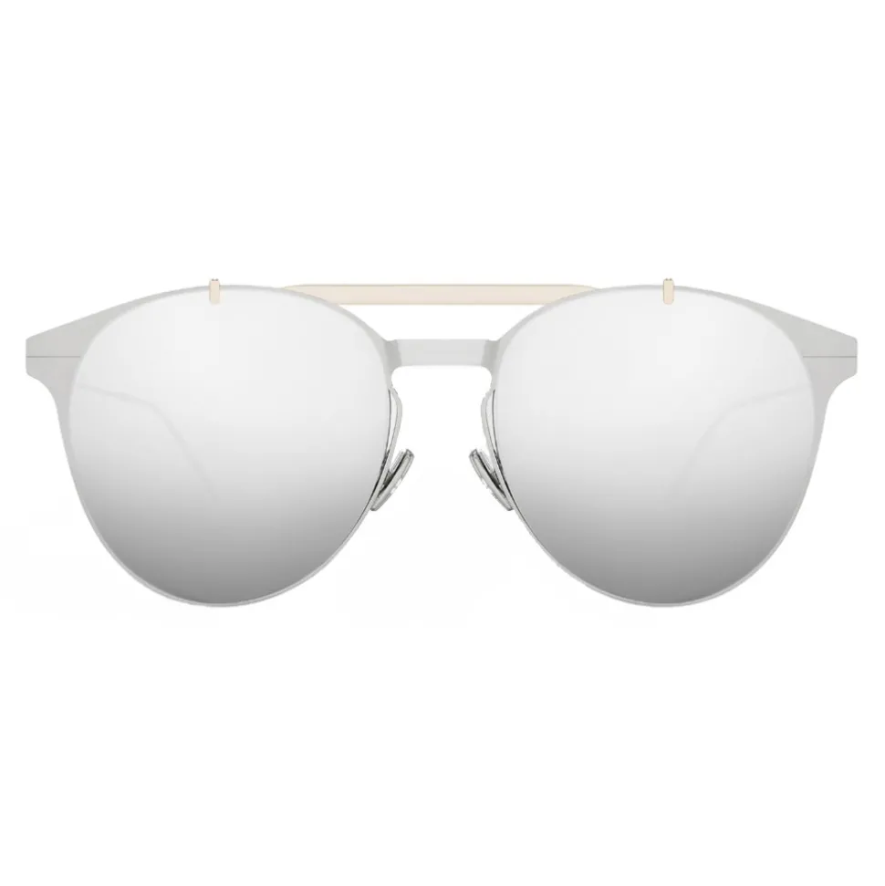 “DiorMotion1” sunglasses with a revised pilot shape. The silver mirror lenses are joined by a double bridge in gilded metal, fixed to the front metal gun with two clips. The gun metal temples reveal the emblematic guilloché motif of the Maison.