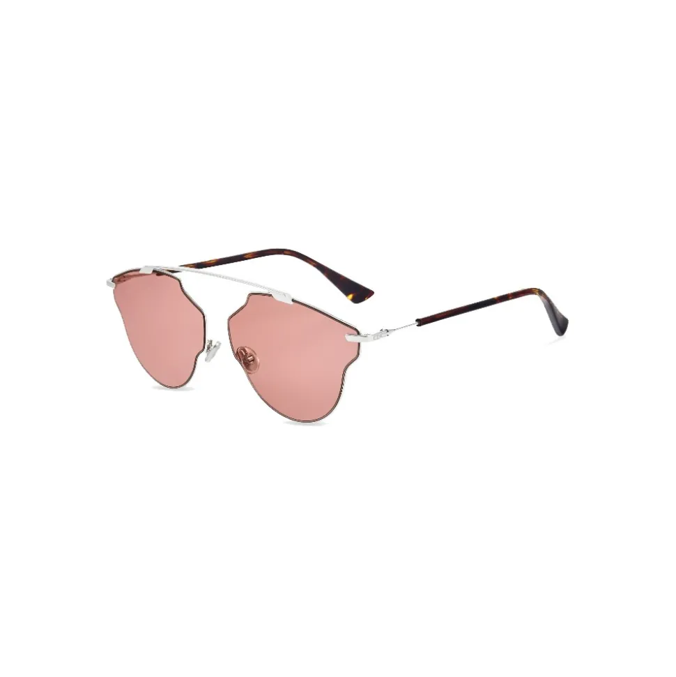 DiorSoRealPop sunglasses reinterpret the Maison’s must model by combining the fineness of metal with the intensity of colored glass. The silver metal front and the thin temples in dark tortoise acetate contrast with the brightness of the pink lenses, for a light, colored and versatile frame.