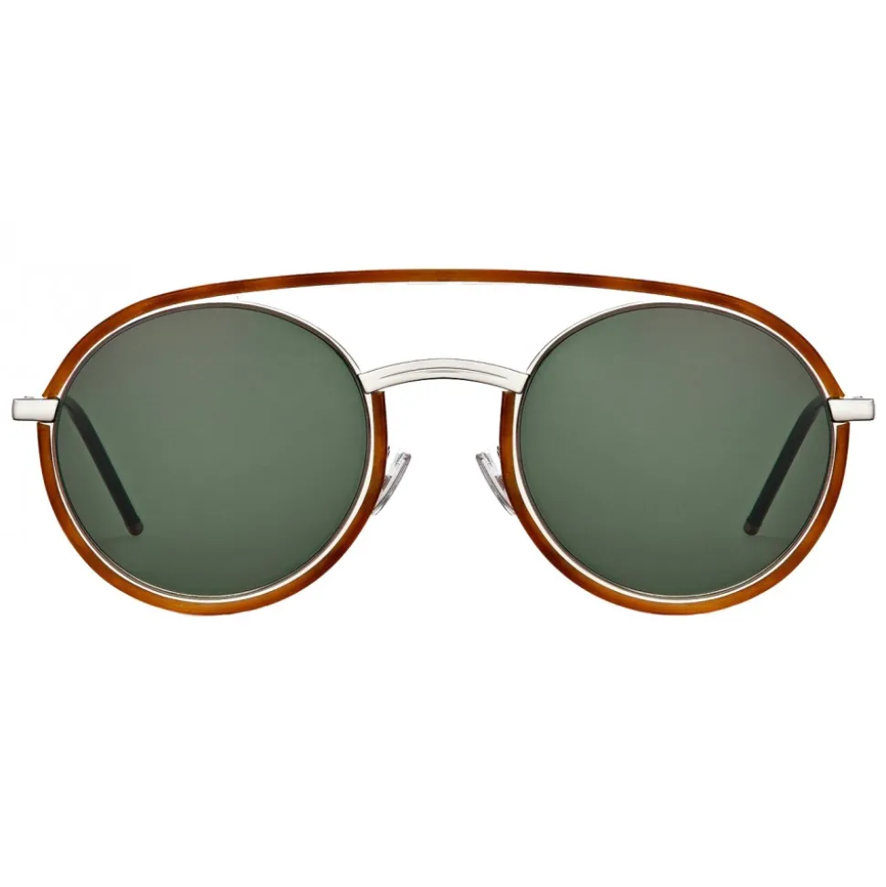 “DiorSynthesis01” sunglasses in light gold metal. The round shaped lenses are joined by a double bridge covered in acetate. The bridge is adorned with the emblematic scar of Dior Homme.