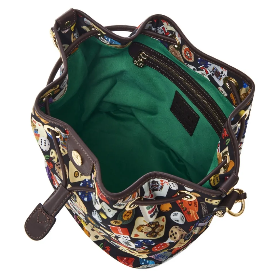 Gold-tone hardware.