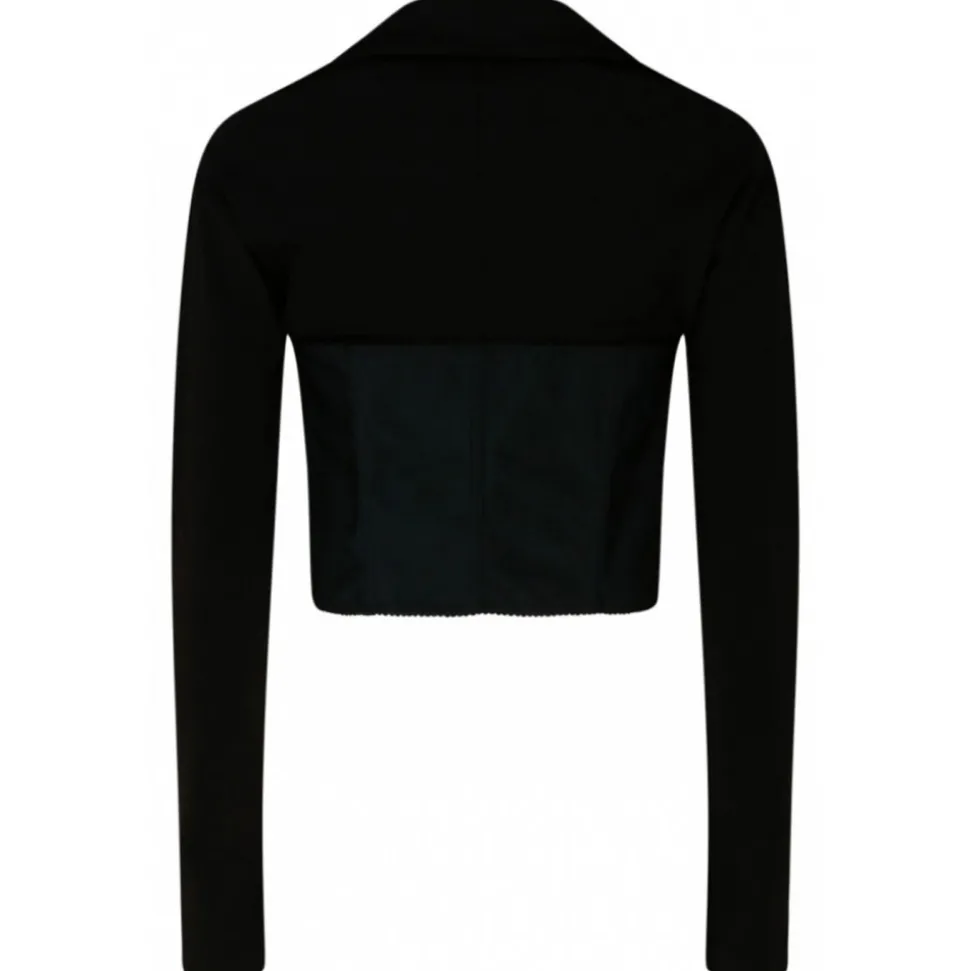 Dolce & Gabbana Black and White Cotton Bustier Shirt. Black and white cotton bustier shirt, corset style, layered effect, oversized pointed collar, moulded cup, number patch to the front, front hook and eye fastening, boned bodice and long sleeves. This item is part of KIM DOLCE & GABBANA collection.