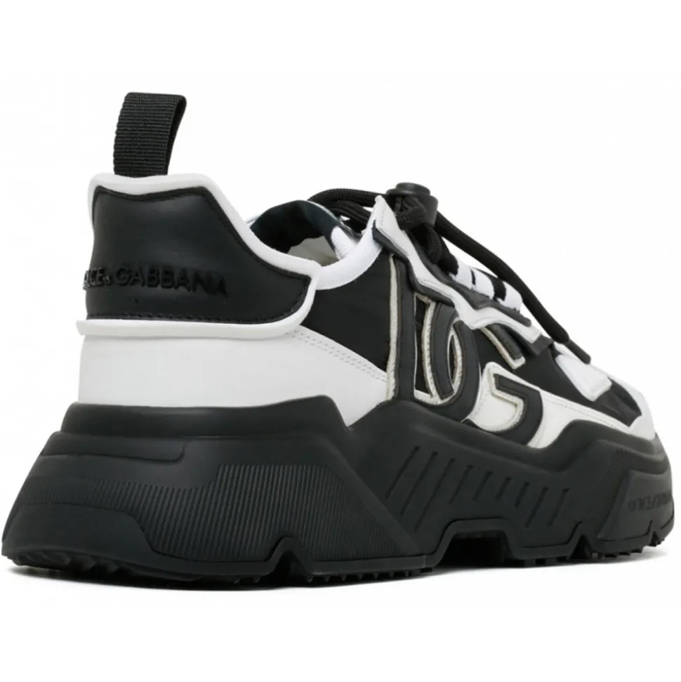Dolce & Gabbana Black and White Leather Day Master Sneakers. Black and white leather sneakers, two tone design, front toggle fastening, logo patch at the tongue, logo patch to the side, branded heel counter, round toe and oversize rubber sole.
