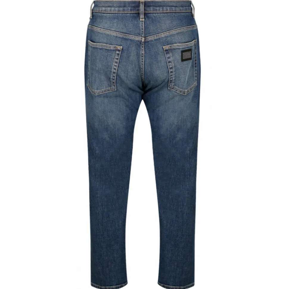 Dolce & Gabbana Distressed Blue Cotton Loose Fit Jeans. Distressed blue cotton jeans, front logo label, logo plaque on the back, button and zip fastening, belt loops, classic five pockets.