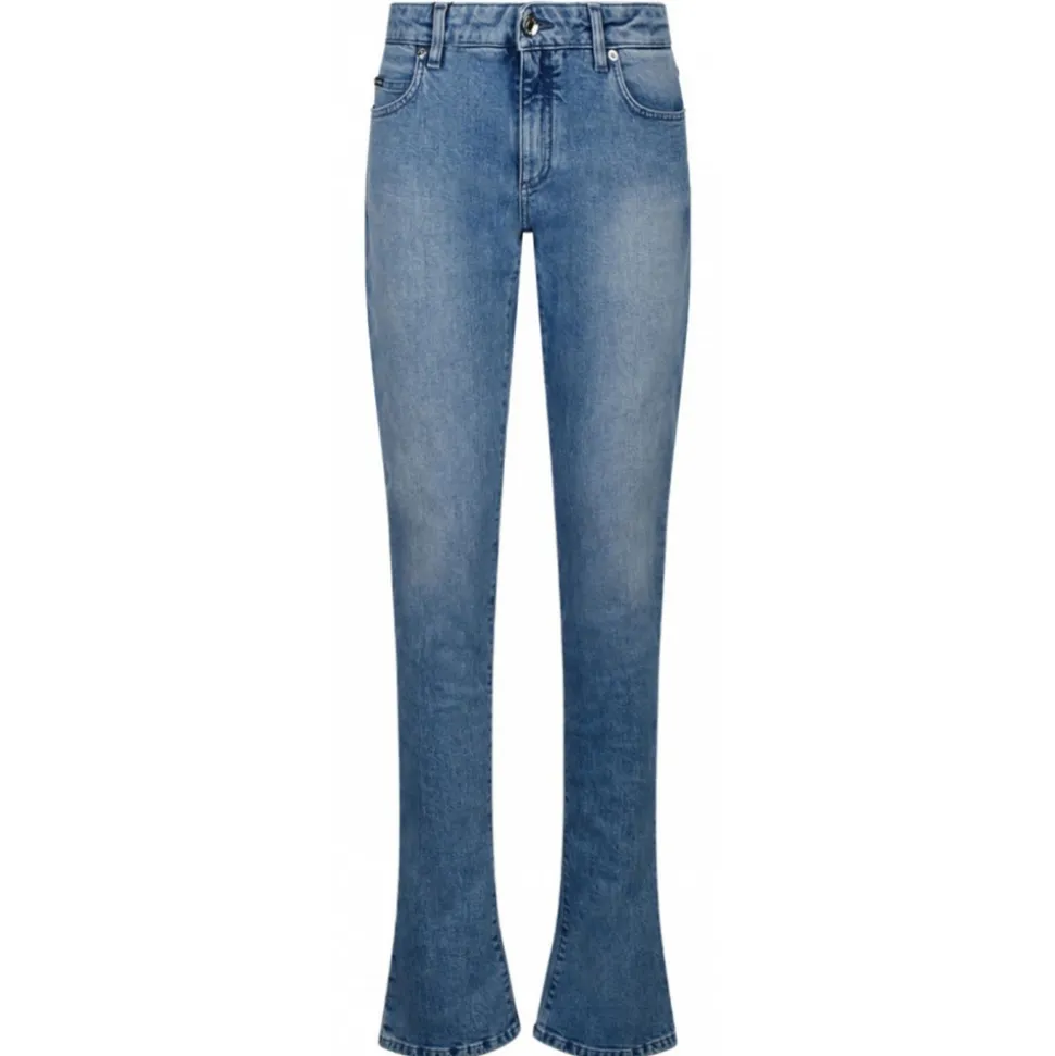 Dolce & Gabbana Light Blue Bootcut Jeans. Light blue cotton jeans, low rise, concealed fly and button fastening, classic five pockets, logo patch to the side, logo plaque, stonewashed, straight hem.