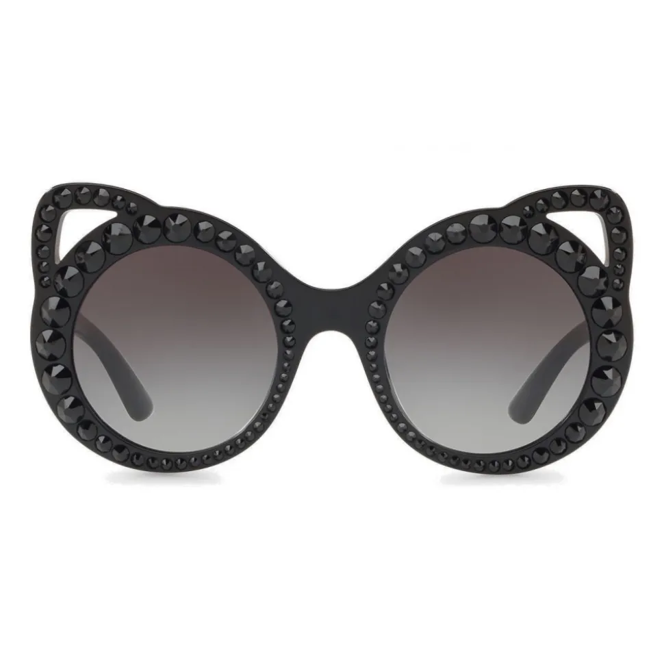 Round acetate sunglasses reflecting the shape of a kitten’s muzzle. The model is characterized by shining black crystals and shaded black lenses. Relevant Dolce & Gabbana logo on the auction.