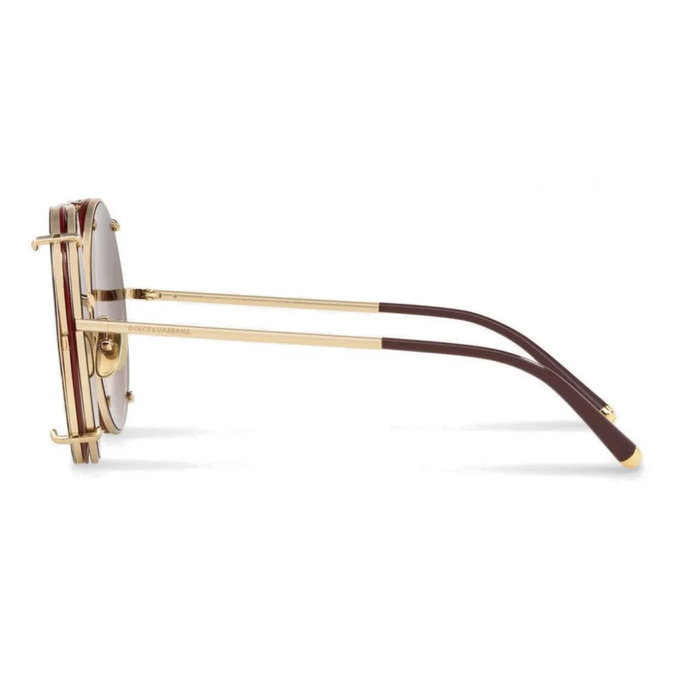Personalization and versatility characterize the round sunglasses in golden metal with shaded lenses. An innovative project that allows you to wear three models with a single frame, changing the clip on characterized by the havana print and Sicilian majolica. The auctions are personalized with the Dolce & Gabbana logo. Comfort is guaranteed by flexible temples and adjustable nose pads.