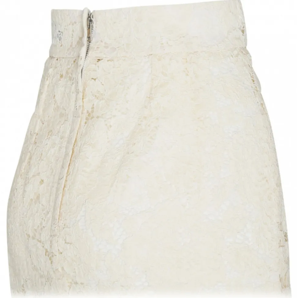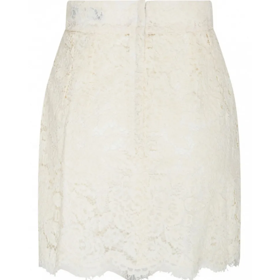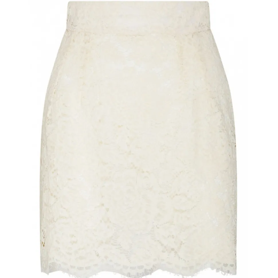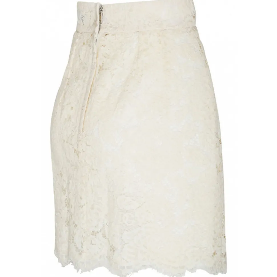 Dolce & Gabbana White Silk Blend Floral Lace Miniskirt. White silk blend miniskirt, floral lace detailing, thigh length, high waist and scallop hem.