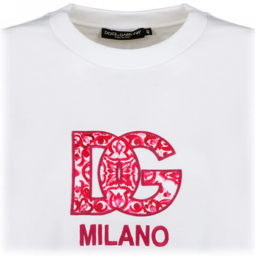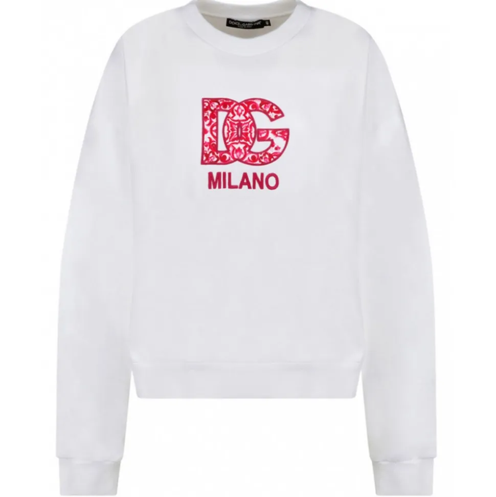 Dolce & Gabbana White Jersey Sweatshirt With DG Fucsia Maiolica Patch. Long sleeves, round neckline, ribbed edge.