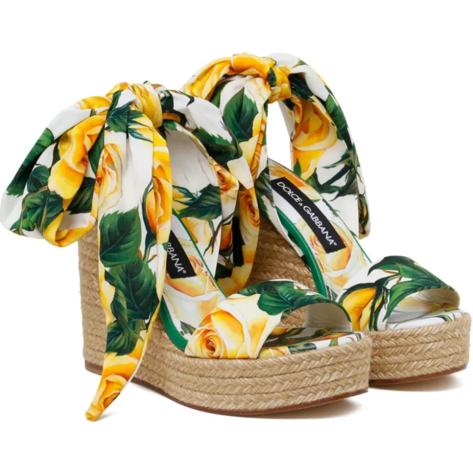 Dolce & Gabbana Yellow Printed Sandals. Yellow rose print charmeuse wedge sandals, 90 mm platform wedge, printed leather insole eighth branded label. Woven rope wedge, branded rubber sole.