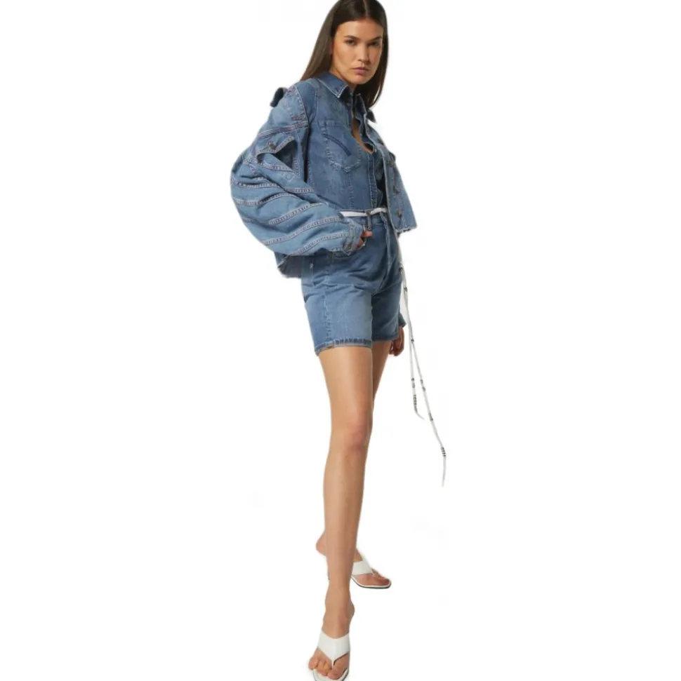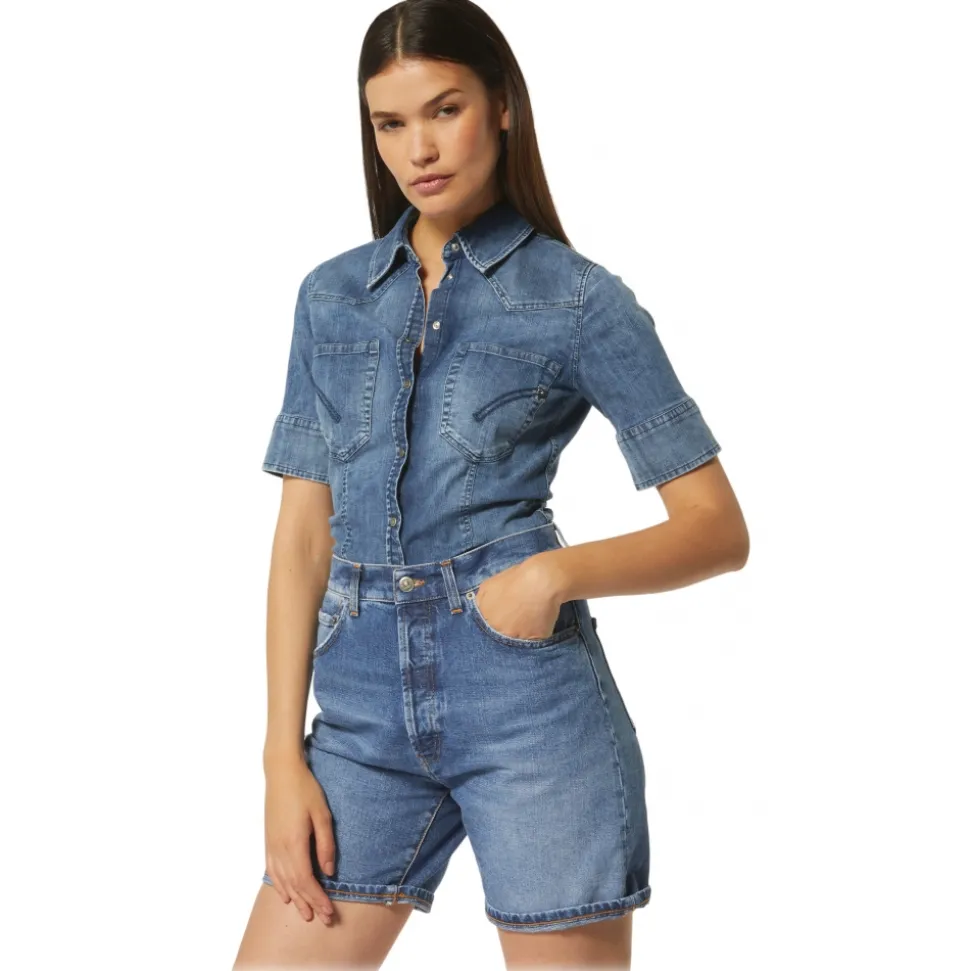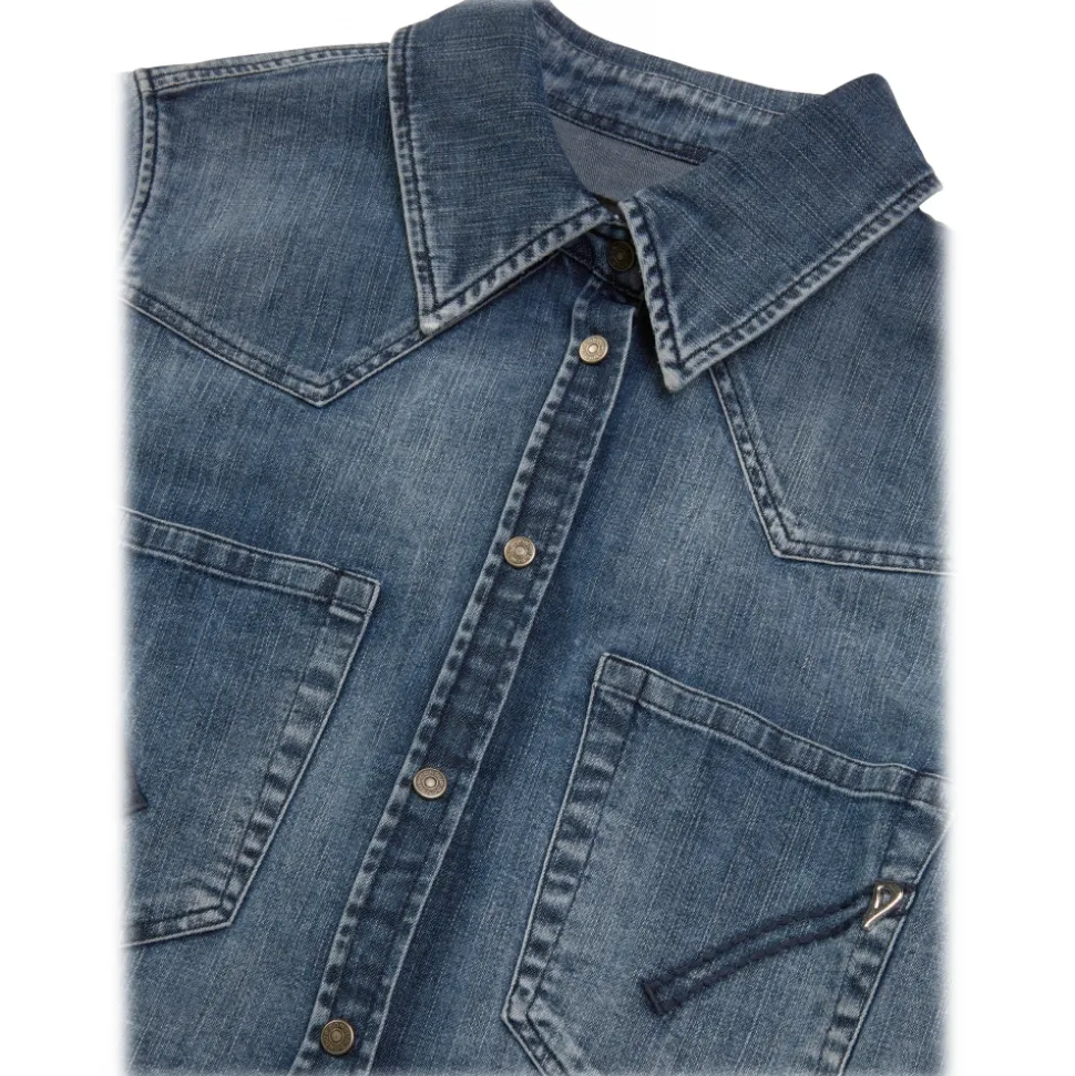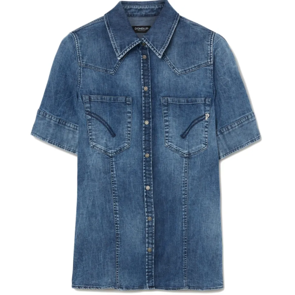 Dondup shirt, western model, fitted and lengthened, with front patch pockets, short flared sleeves, with clip buttons, in denim fabric, washed out.
