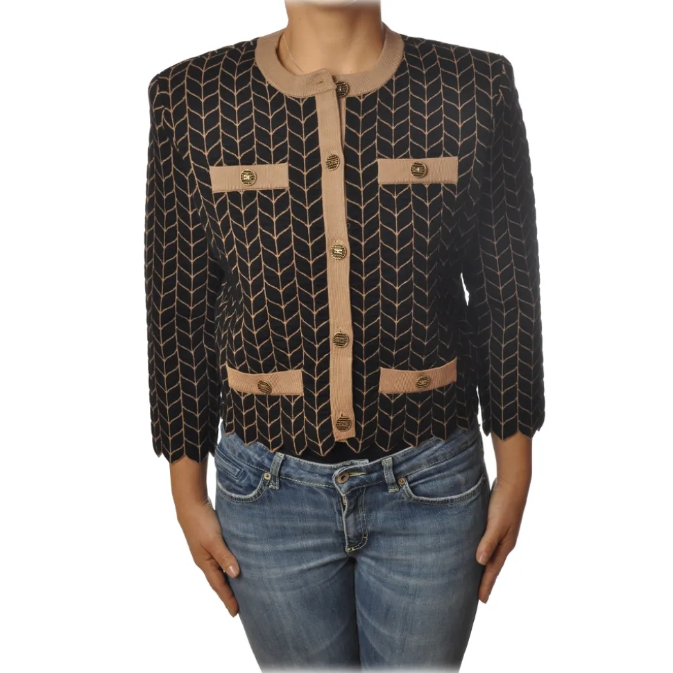 Elisabetta Franchi sweater, chanel-type model, 3/4 sleeve crew-neck, with jewel closure buttons on the front, with four fake pockets, in fantasy worked with scallop on the bottom.