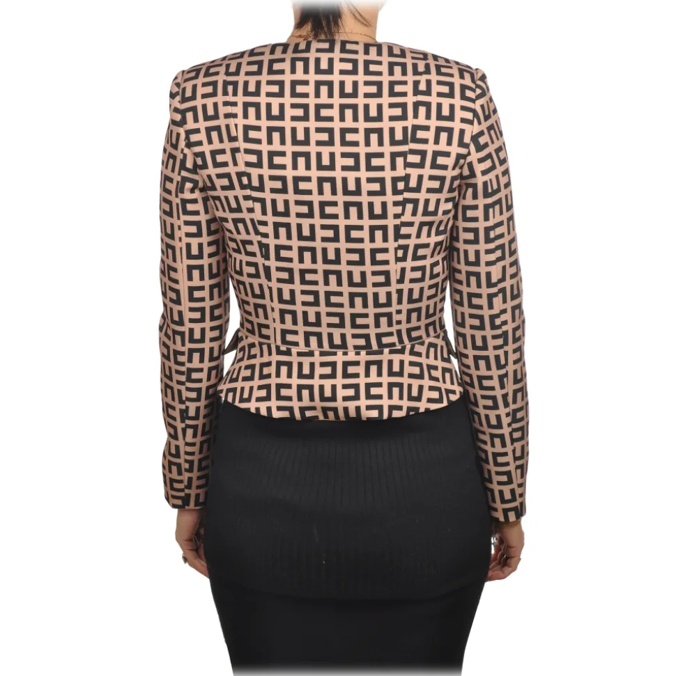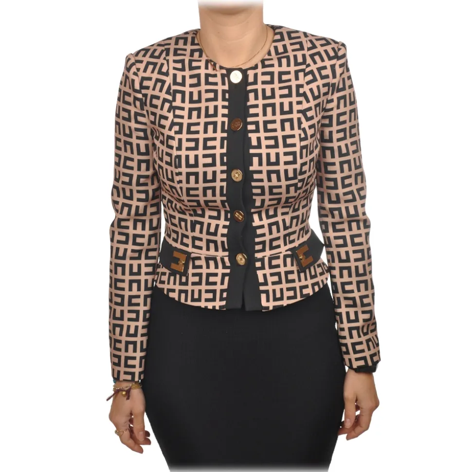 Elisabetta Franchi – Collarless Jacket in Logo Pattern – Black/Beige – Jacket – Made in Italy – Luxury Exclusive Collection