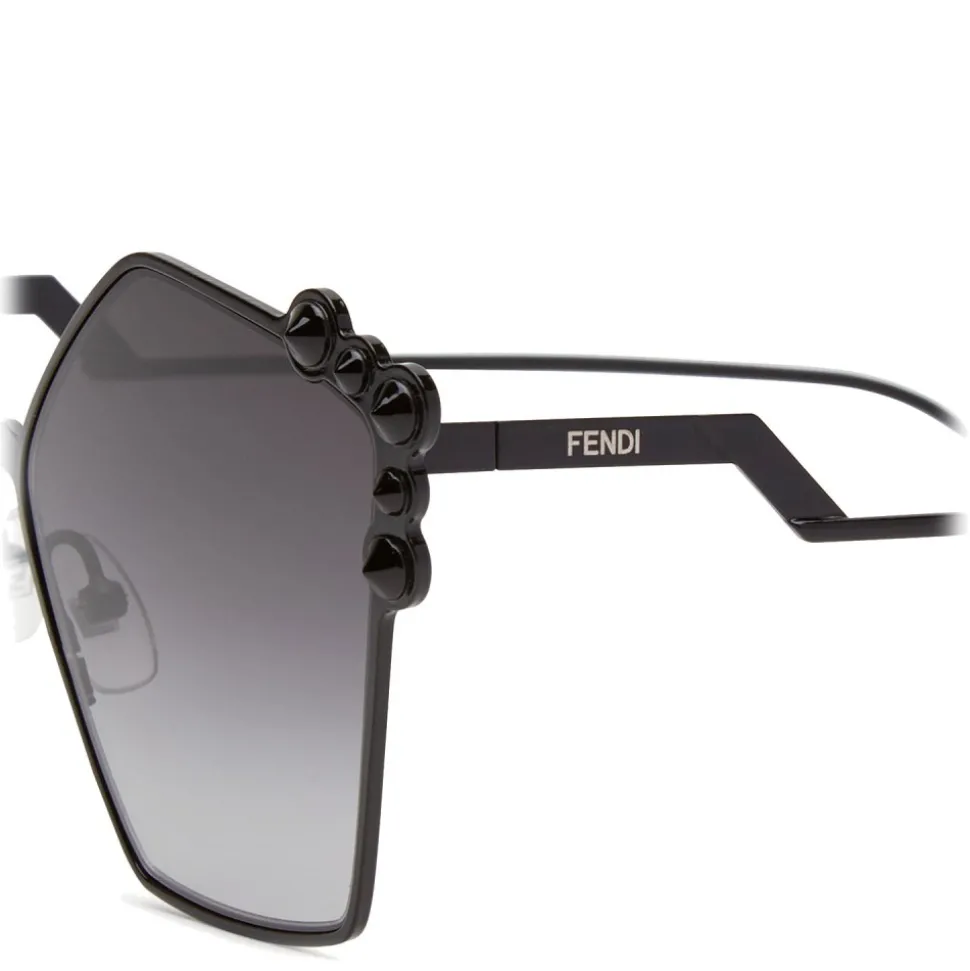 Can Eye sunglasses with an original pentagon shape, reinterpreted for a feminine and modern allure. The black metal frame, very light and comfortable to wear, is embellished with small tone-on-tone studs. The rods with an angled cutting badge are completed by an engraved Fendi logo. Gray gradient lenses.