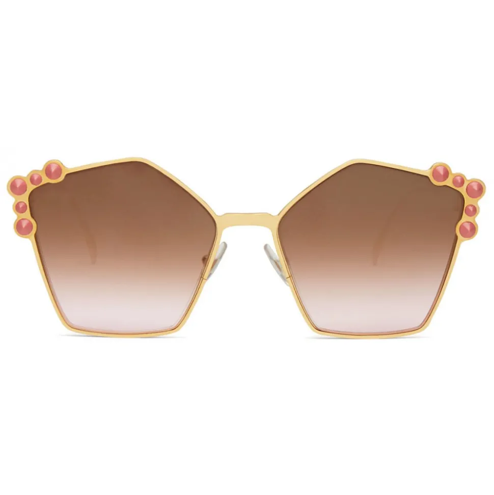Can Eye sunglasses with an original pentagon shape, re-interpreted for a feminine and modern allure. The metal frame with pink gold finish, very light and comfortable to wear, is embellished with small shiny pink stones and scalloped edge. The rods with an angled cutting badge are completed by an engraved Fendi logo. Brown and pink gradient lenses.