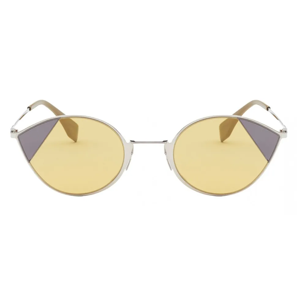 Cut-Eye sunglasses featuring a small cat-eye shape. The model is made of light metal with silver finish. Thin temples with engraved logo, brown acetate ends and iconic triangle detail. Flat bridge and adjustable nose pads. The innovative construction of the lenses, with a distinctive geometric cut that creates a contrasting angle, is emphasized by the mix of pastel yellow and gray shades.