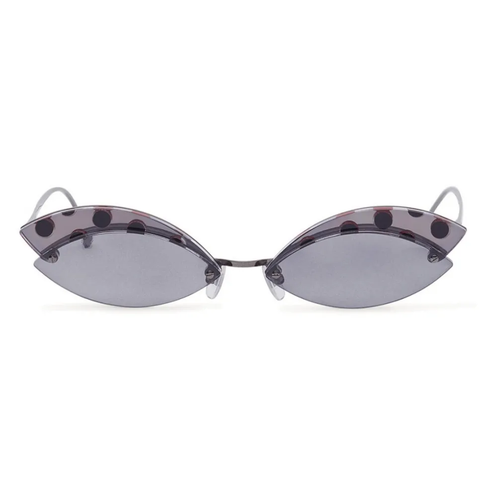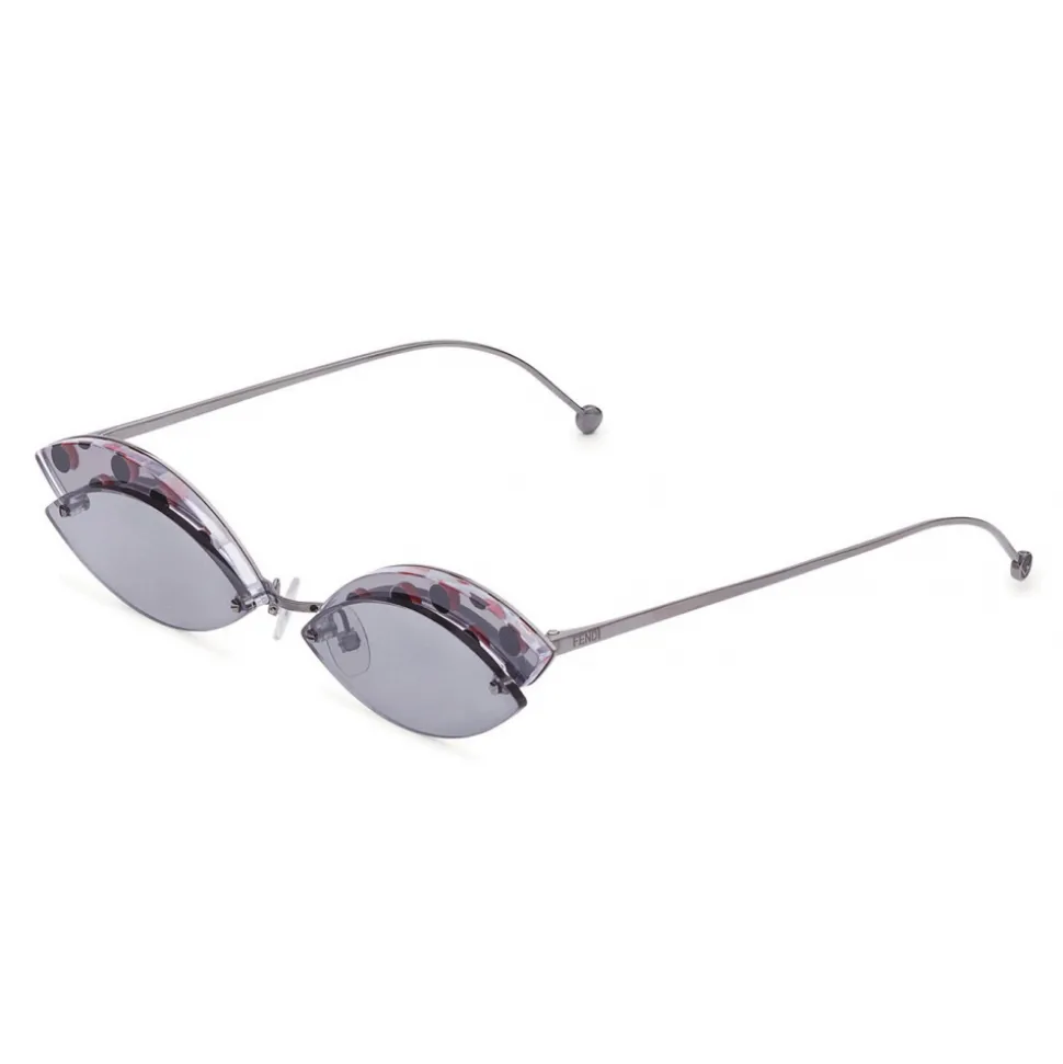 DeFender sunglasses with an innovative butterfly design. The front features flat and ciliate lenses in optyl with a red and black polka dot pattern. The metal rods with ruthenium finish are completed by the Fendi lettering and round end in the shape of the F is Fendi logo. Smoke gray lenses. Made in Italy.
