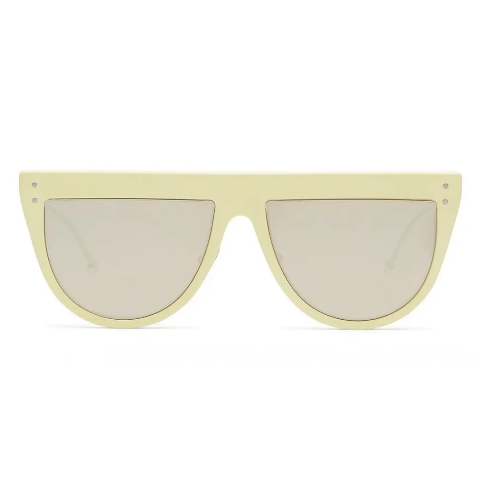 DeFender sunglasses with an oversized aviator shape featuring an innovative flat-top design. The front is made of yellow optyl and the thin metal temples with gold finish, complemented by the Fendi lettering and round terminals in the shape of the F is Fendi logo. Adjustable nose pads. Flat lenses with gold mirror effect. Made in Italy.