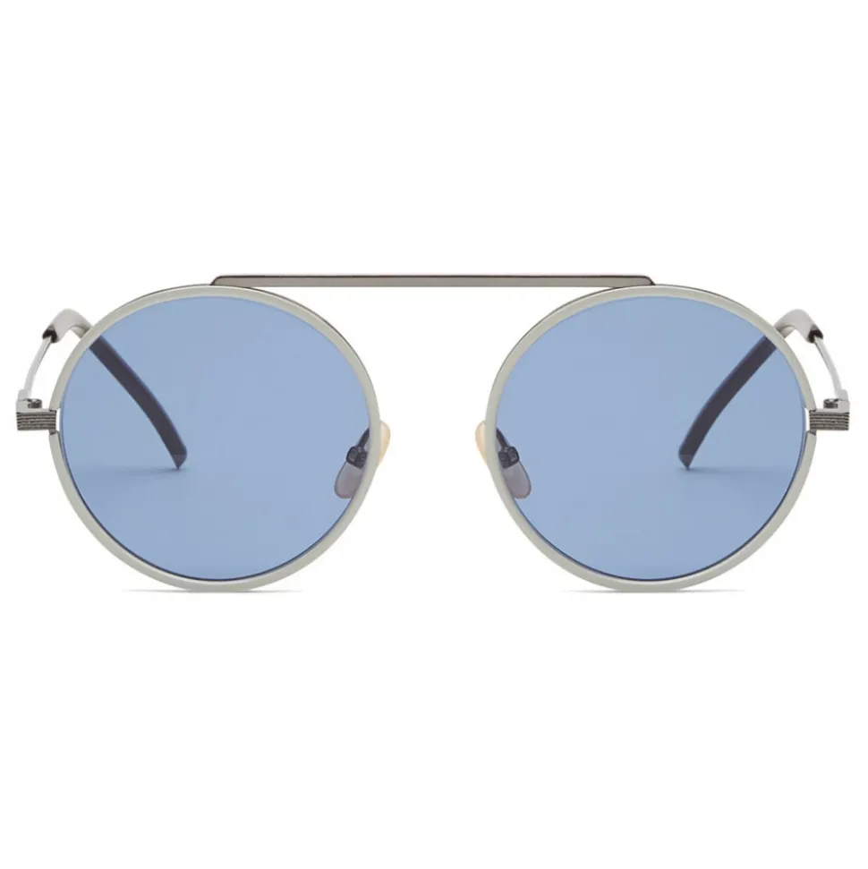 Everyday Fendi sunglasses with a round shape, characterized by a distinctive design that expresses a business-casual mood. The frame is made of metal with dark ruthenium finish, with a white acetate layer that creates a modern bi-layer effect. The high bridge is finished with contrasting painted edges. The triangular shape of the temples is an exclusive feature of Fendi eyewear, highlighted by the black terminals. Fendi logo engraved. Gray-blue lenses.