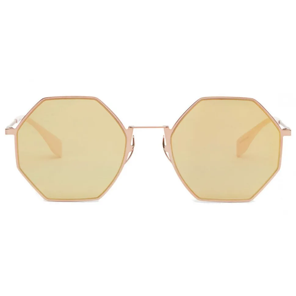 Eyeline sunglasses with a distinctive octagonal shape. The frame is in metal with pink finish. The thin temples feature the laser-engraved Fendi logo and tone-on-tone terminals, personalized with an iconic triangle. Pink gold multilayer lenses.