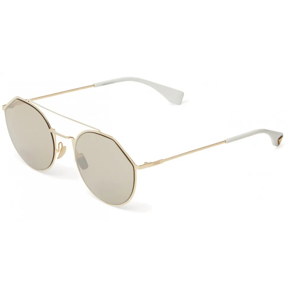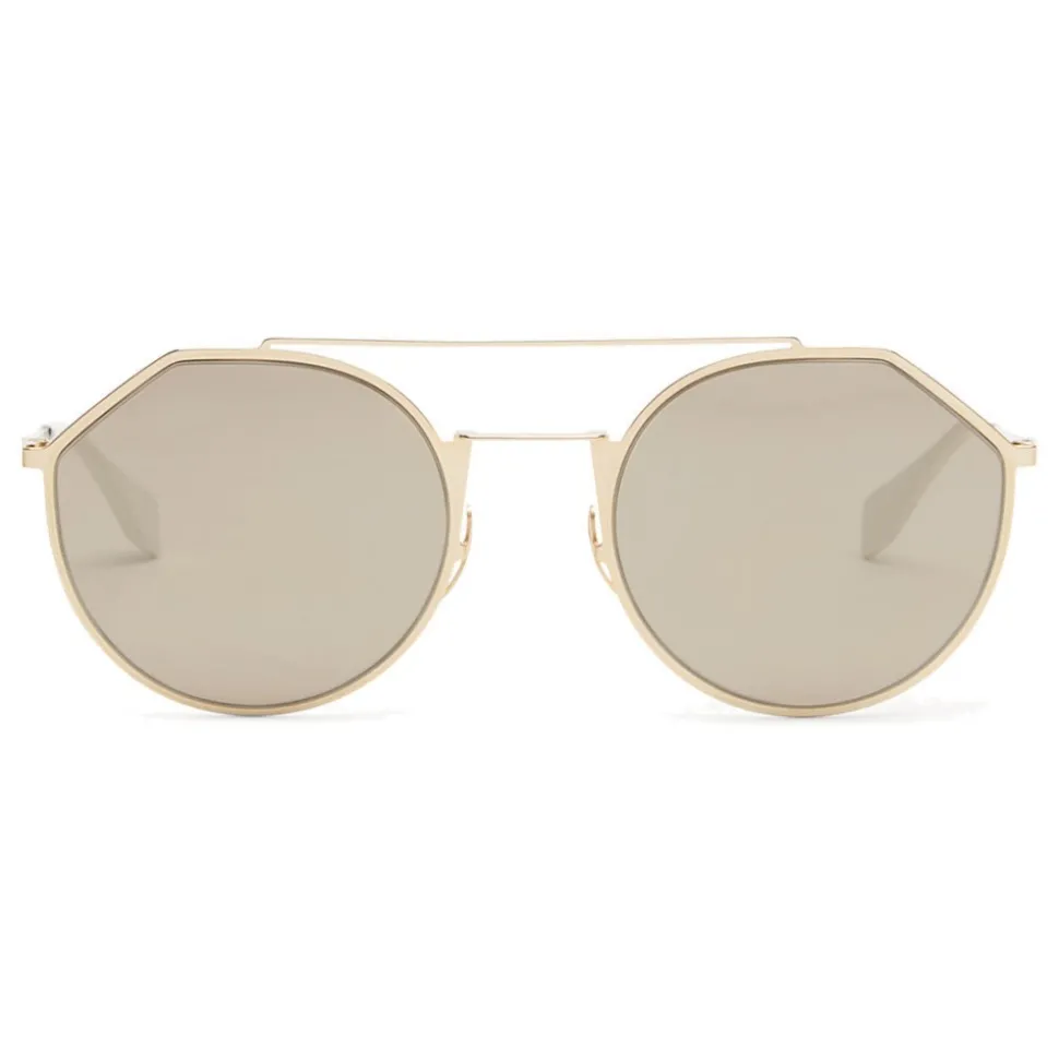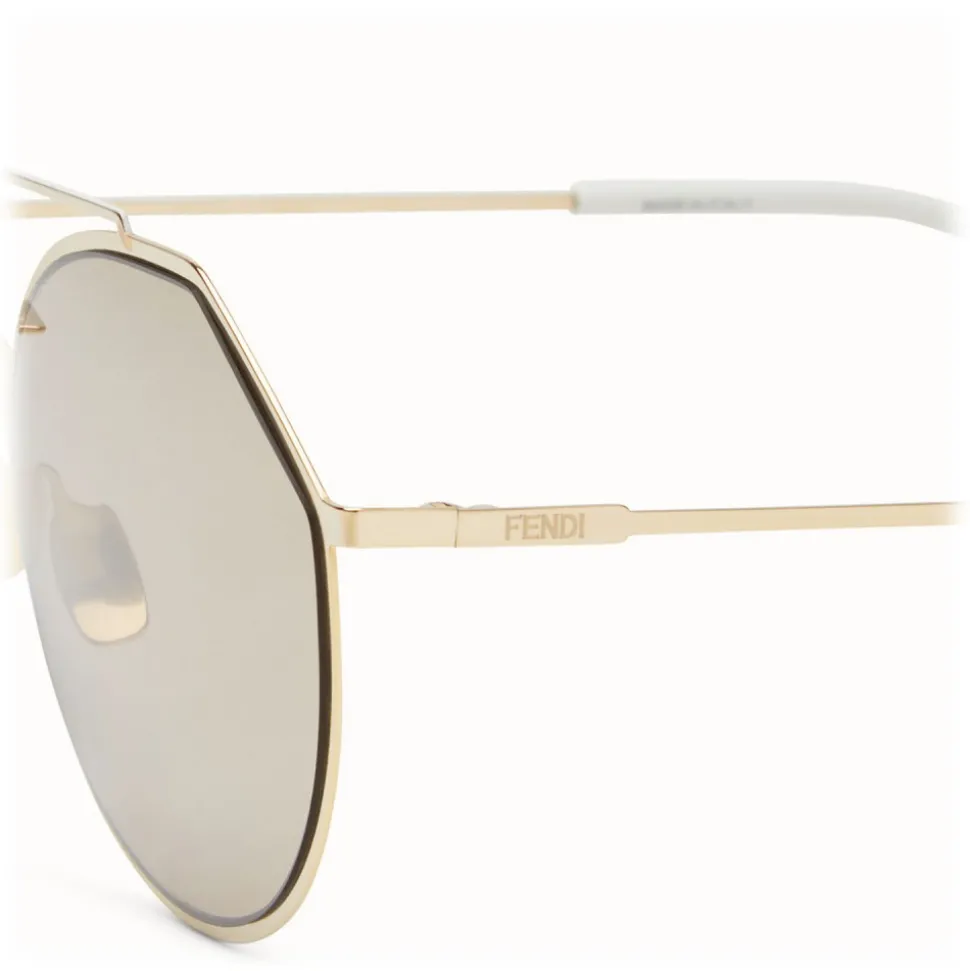 Eyeline sunglasses characterized by a flat and minimal design, with iconic details and color contrasts that give a graphic touch. The frame has a rounded pilot shape, made of metal with golden finish. Double bridge with contrast painted border and adjustable nose pads for maximum comfort. The thin temples are completed by white terminals, personalized with the iconic triangle. Fendi logo engraved. Lenses with mirrored gold effect.