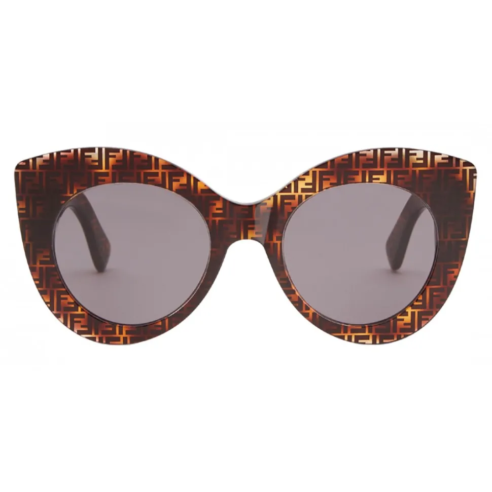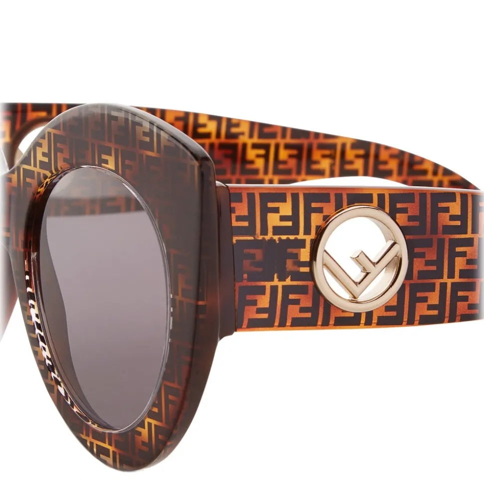 F is Fendi sunglasses with cat-eye frame in acetate, with a large and modern shape. The temples are made of optyl havana with an exclusive all-over FF pattern. New Fendi logo in rose gold metal. Gray lenses.