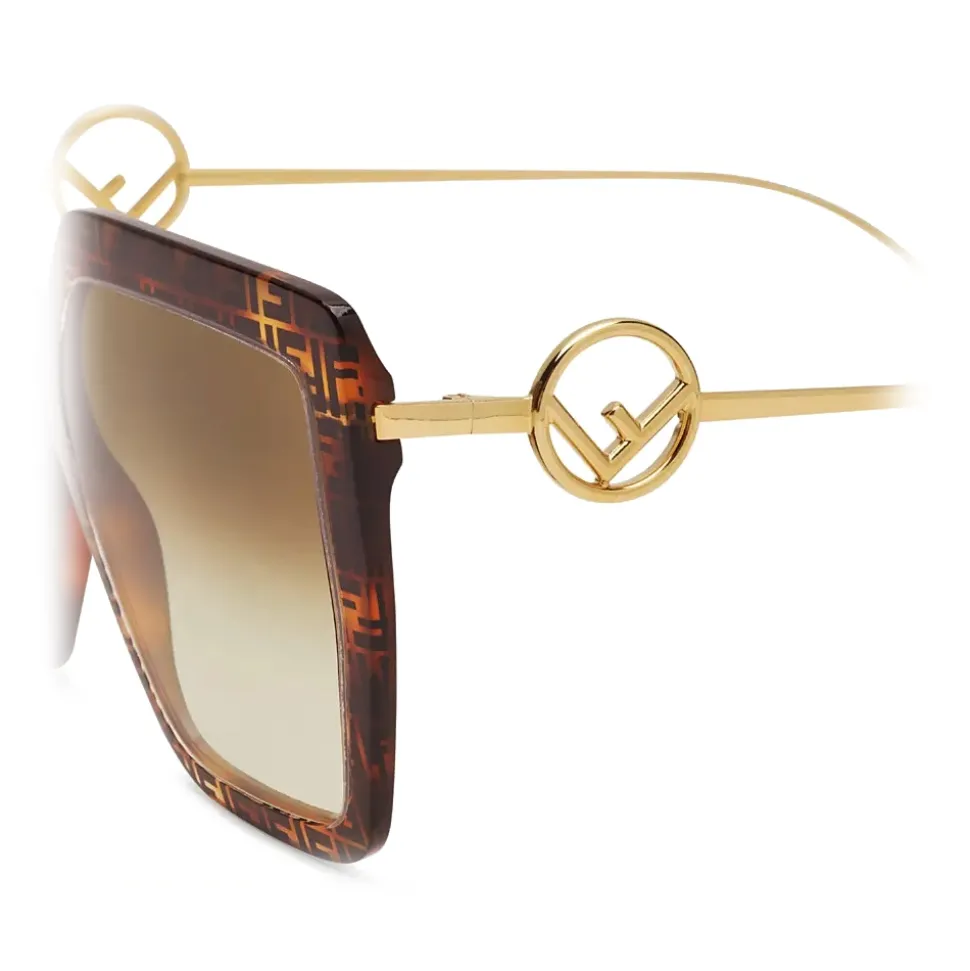 Havana-color model made in exclusive Fendi acetate with FF logo. Oversized square mounts with gold-colored metal temples. Temples decorated with F IS FENDI logo and round metal tips. Brown gradient lenses. Adjustable nose pads. Made in Italy.