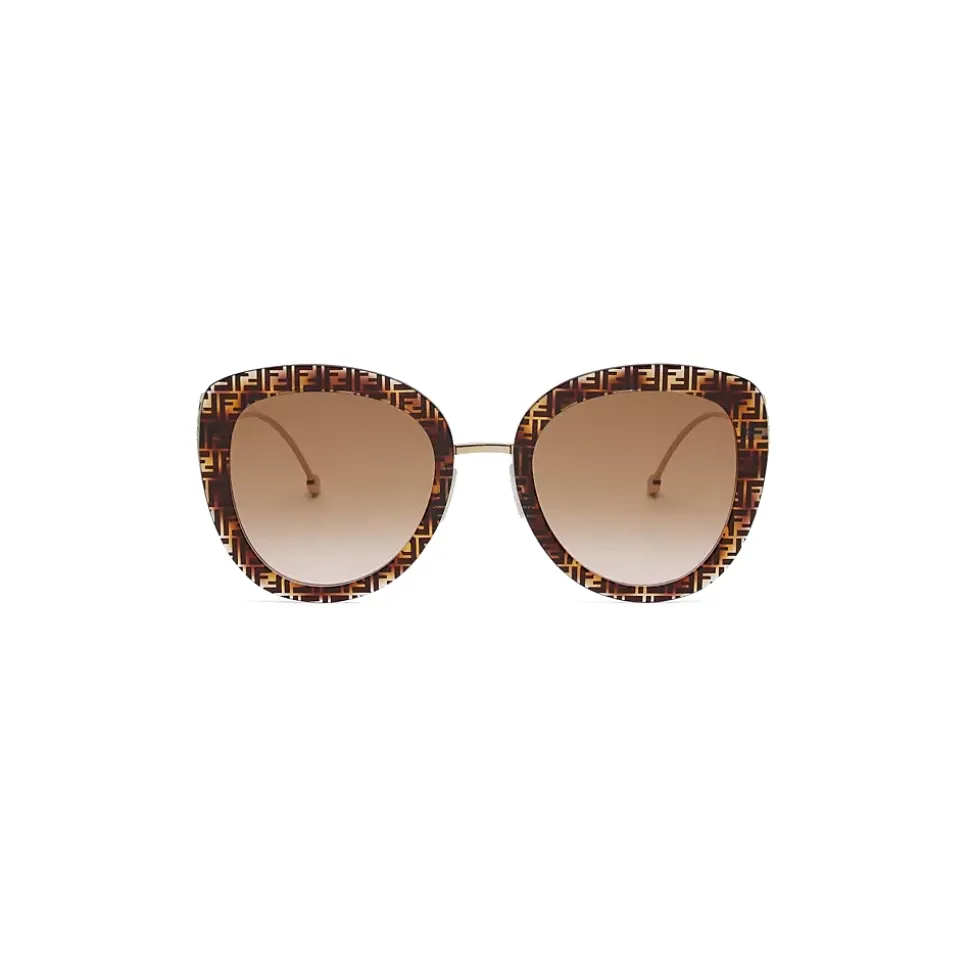 Havana-color model made in exclusive Fendi acetate with FF logo. Round mounts with bridge and temples in gold-colored metal. Temples decorated with F IS FENDI logo and round metal tips. Two-tone lenses in brown to pink gradient. Adjustable nose pads. Made in Italy.