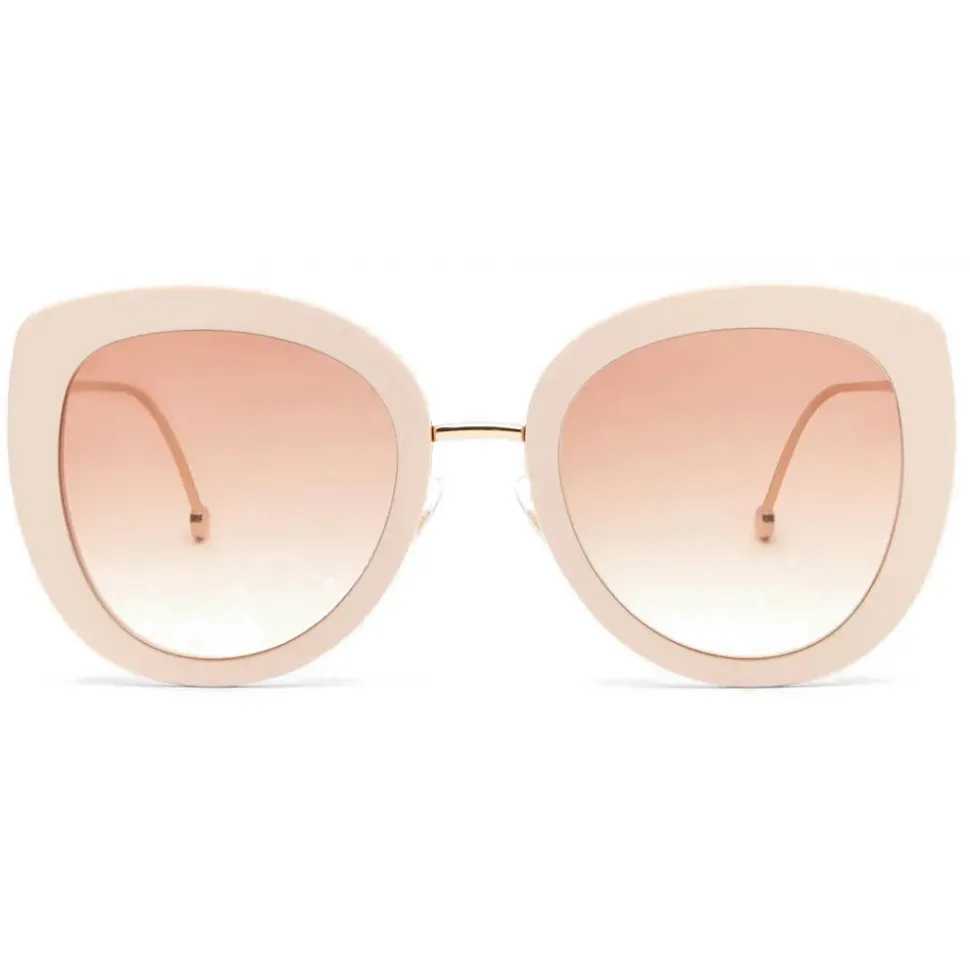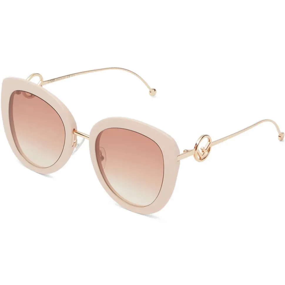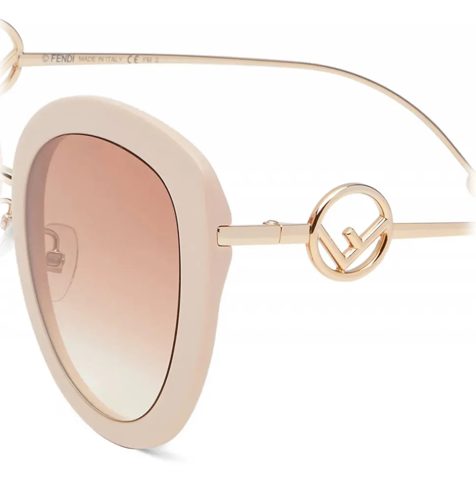 Round model made of pink acetate with gold-colored metal bridge and temples. Temples decorated with F IS FENDI logo and round metal tips. Brown gradient lenses. Adjustable nose pads. Made in Italy.
