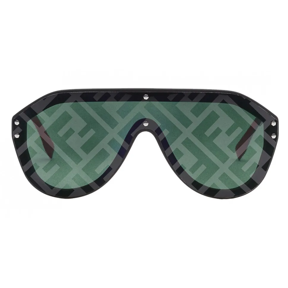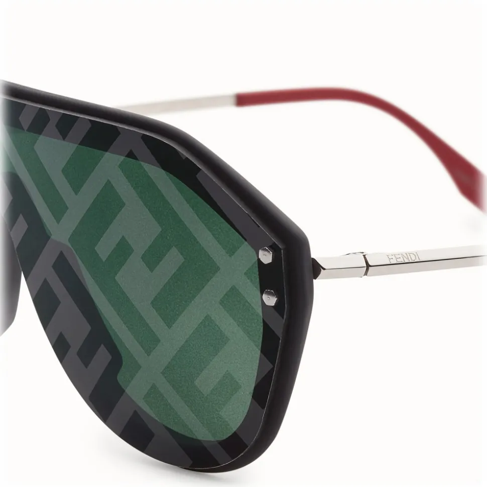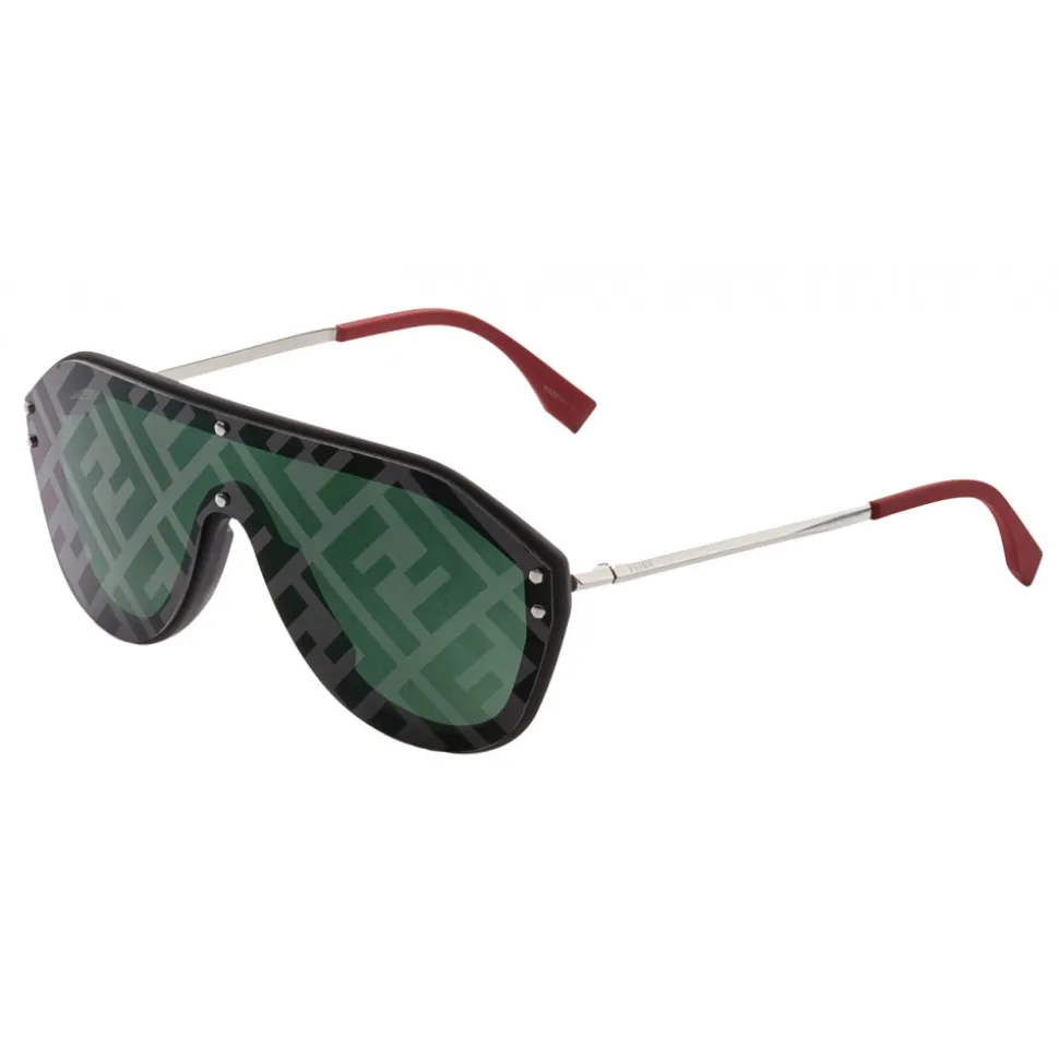 Fendi Fabulous shield sunglasses. The design is a blend of innovative sporty lines and the best craftsmanship, graphics and colours. The rubber-texture black frame is matched with silver-finish metal temples and red rubberised temple tips. The single green lens is decorated with a cliché print of the iconic FF motif with tone on tone mirror effect. Laser-engraved Fendi logo on the temple.