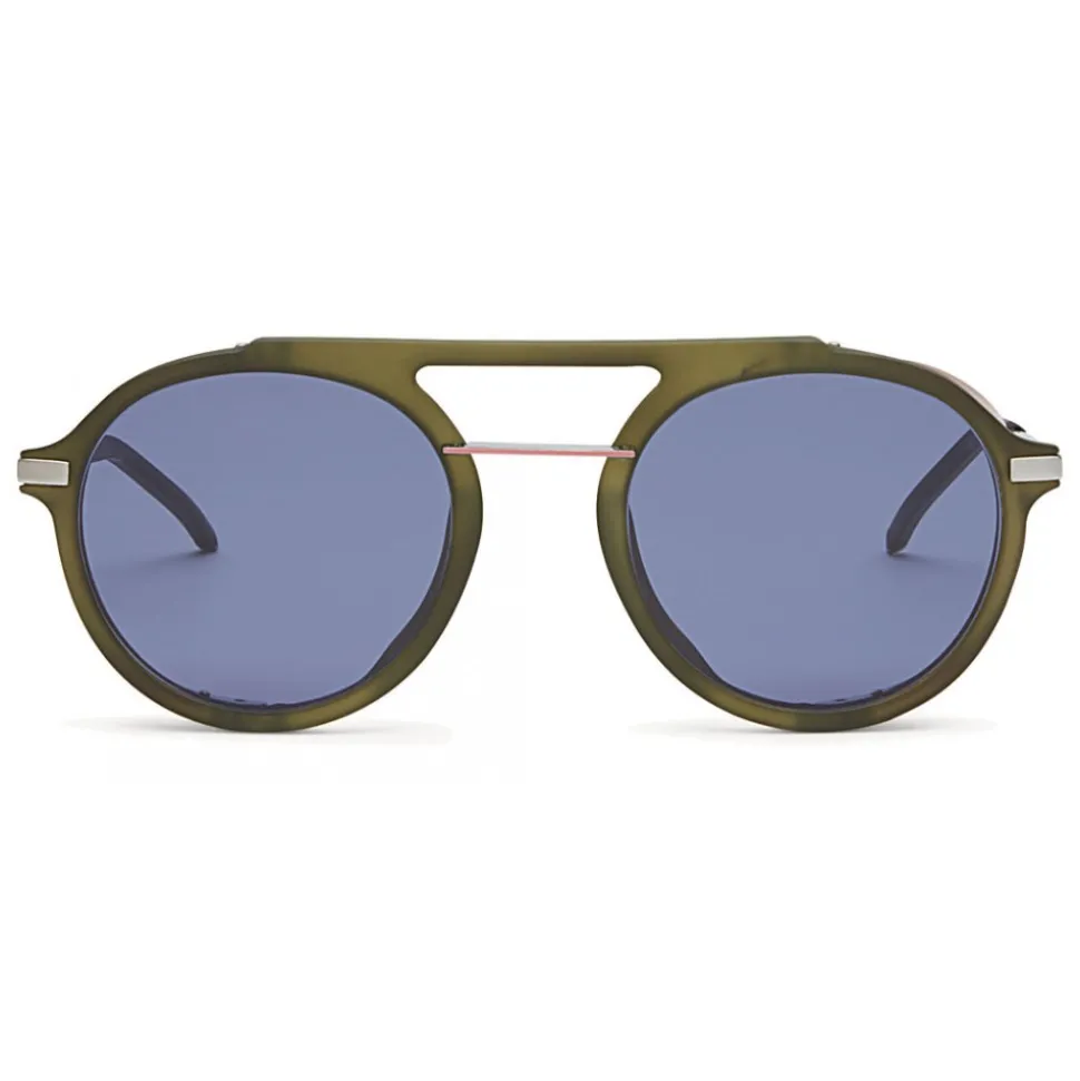 Fendi Fantastic sunglasses with a sporty and dynamic design, in perfect harmony with the mood of the collection. The round shape aviator frame is made of satin green equator optyl, with yellow metal bridge. The side spoons in transparent red acetate complete the game of contrasting colors and textures, adding a modern and distinctive touch. Triangular metal rods with rubberised terminals and engraved Fendi logo. Blue lenses.