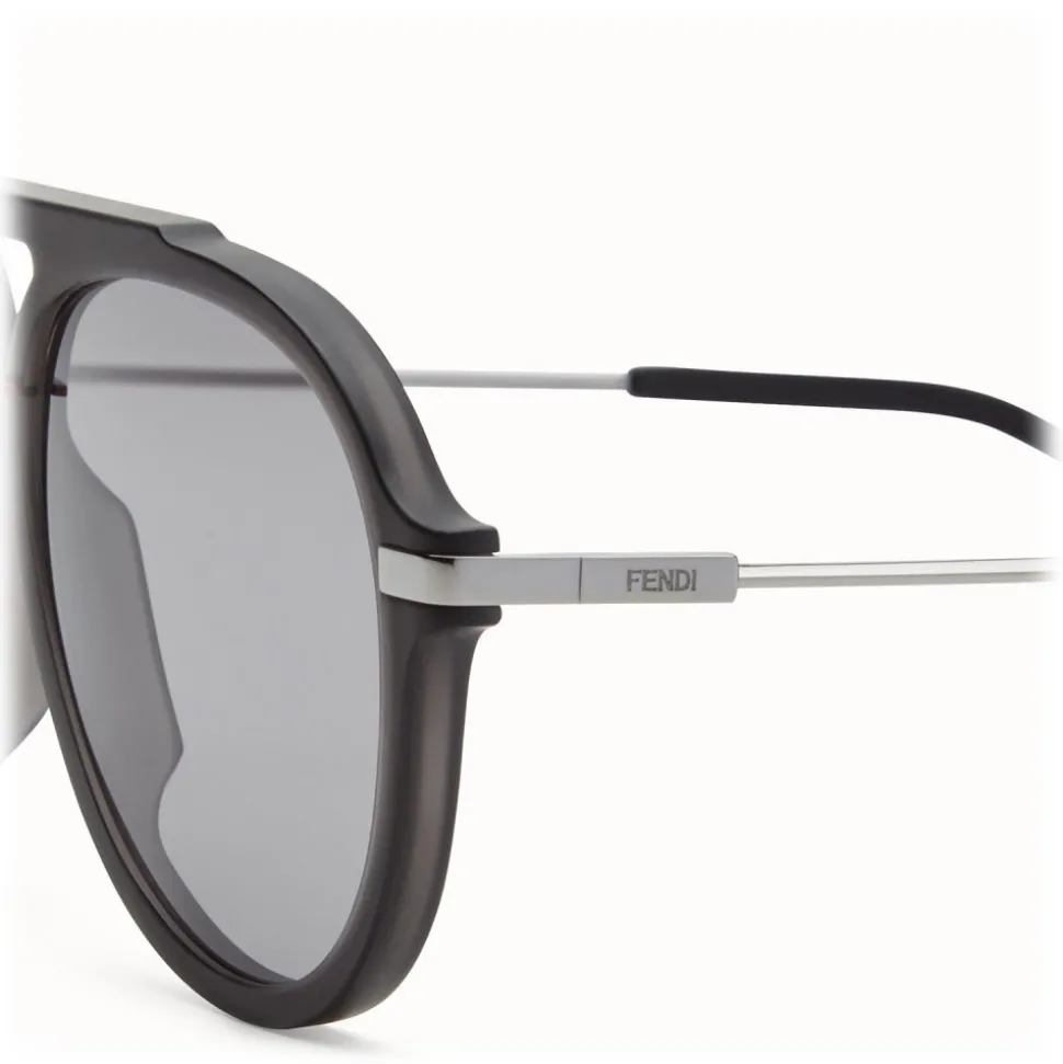 Fendi Fantastic sunglasses with an oversized aviator shape, interpreted in a mix of sporty textures and pop colors. The frame is in optyl black satin, slightly transparent, with a red metal bridge that creates a distinctive color block effect. Thin triangular metal rods with ruthenium finish, complemented by rubberised terminals and engraved Fendi logo. Gray lenses.