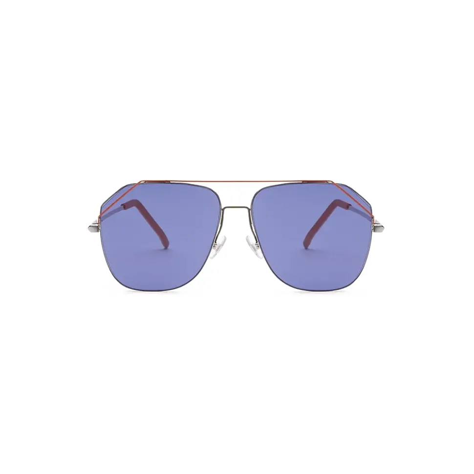 FendiFiend caravan sunglasses, made of metal with a light gold finish. The style is distinguished by a “UFO” construction, an orange metal wire that frames the lenses, creating an unique geometric effect. Triangular temples customized with engraved Fendi logo and orange tips. Slender bridge and adjustable nosepads. Blue lenses. Made in Italy.
