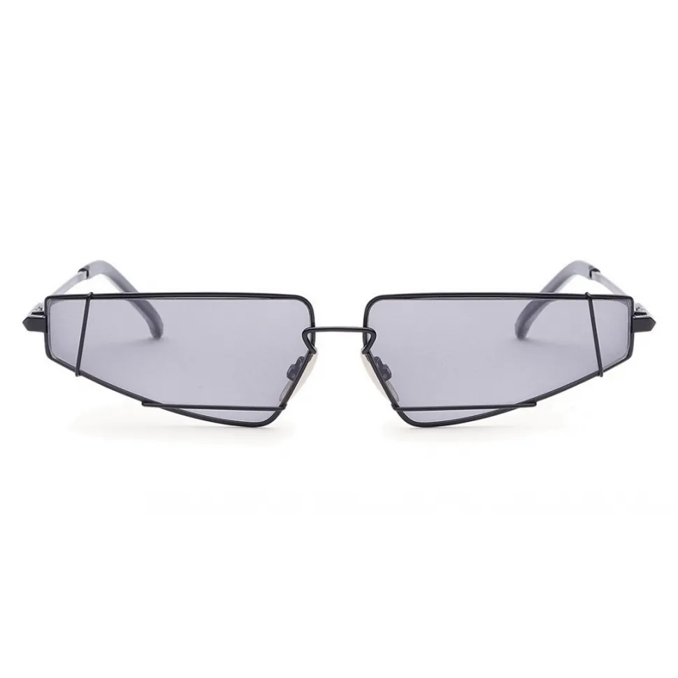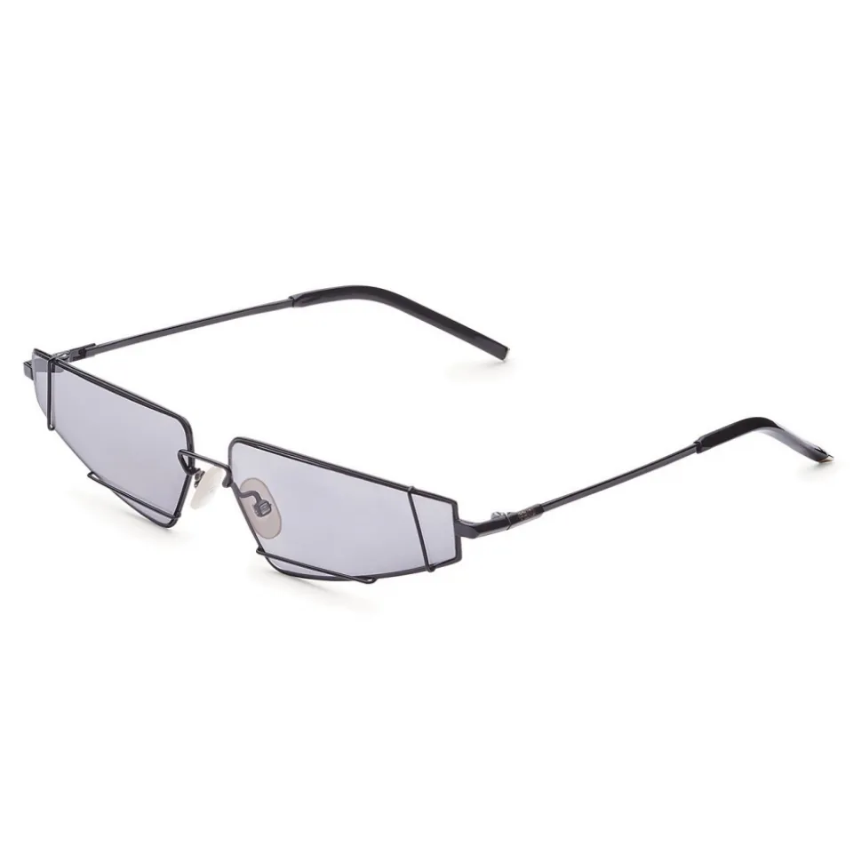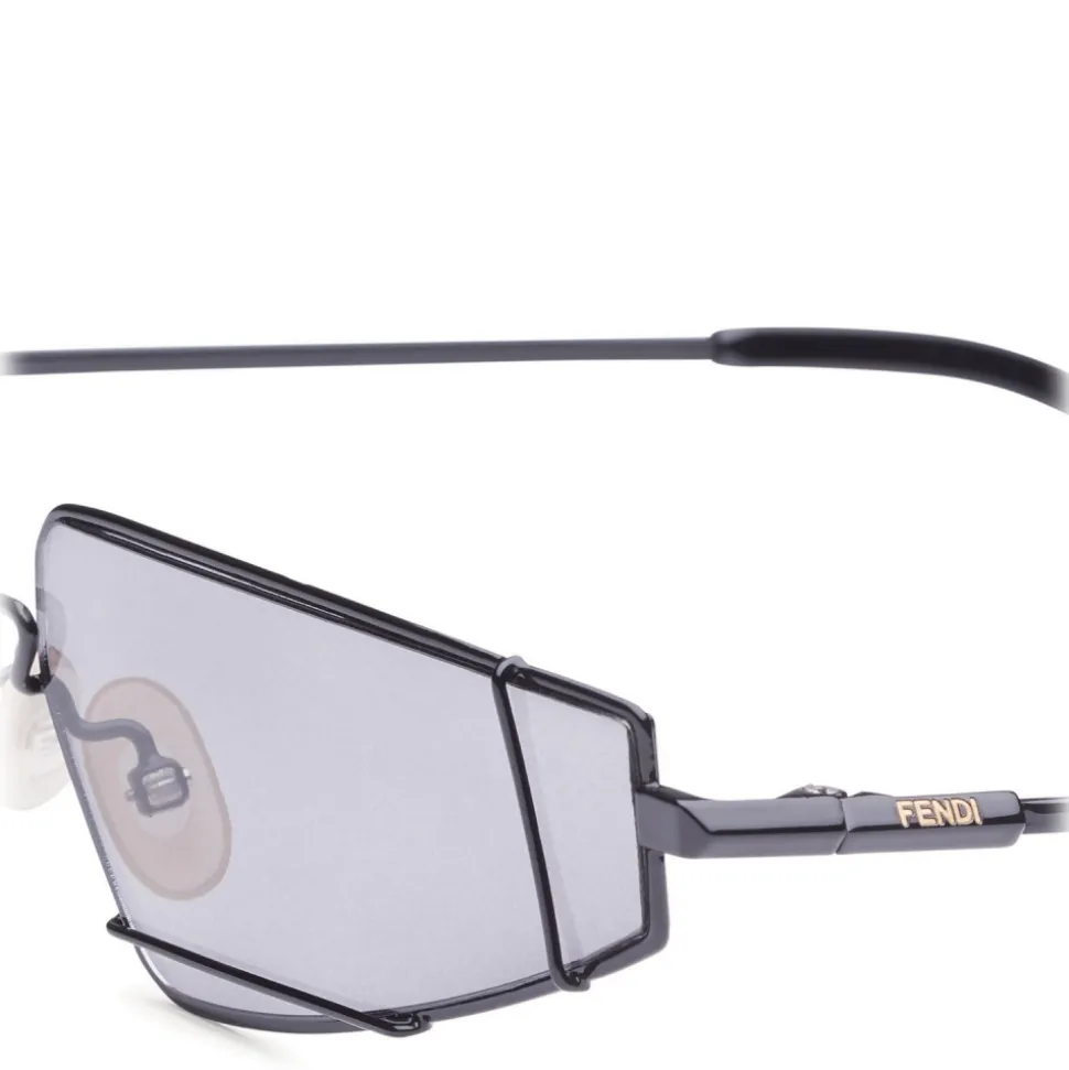 FendiFiend sunglasses characterized by a contemporary cat-eye shape. The model is made of black metal and features the new “UFO” construction, a metal wire that frames the lenses creating a retro-futuristic geometric effect. Triangular custom temples with engraved Fendi logo and tone-on-tone terminals. Adjustable nose pads. Gray lenses. Made in Italy.