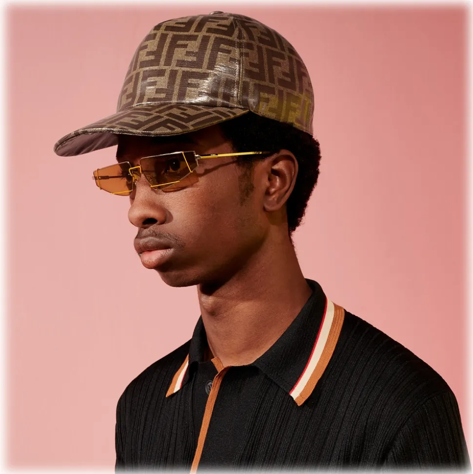 FendiFiend sunglasses characterized by a contemporary cat-eye shape. The model is made of metal with a gold finish and features the new “UFO” construction, a brown metal wire that frames the lenses creating a retro-futuristic geometric effect. Triangular custom temples with engraved Fendi logo and brown terminals. Adjustable nose pads. Brown lenses. Made in Italy.