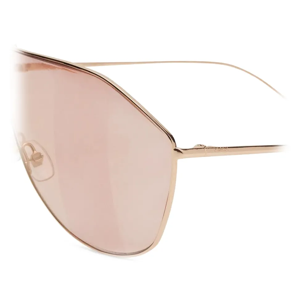 Shield sunglasses in gold-colored metal with slender temples and flat tips. Pink lenses with with iconic gold mirror-effect Pequin motif all over. Adjustable nose pads. Made in Italy.