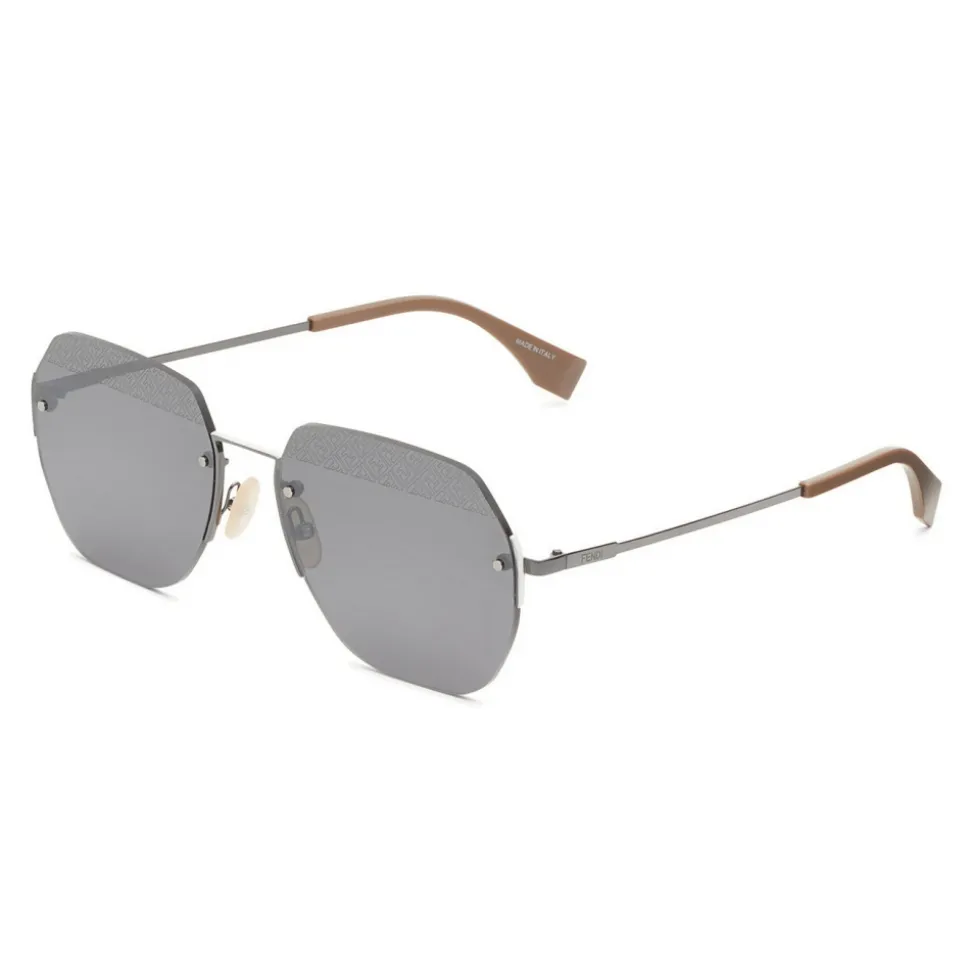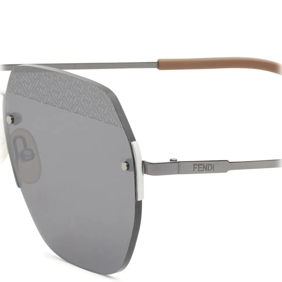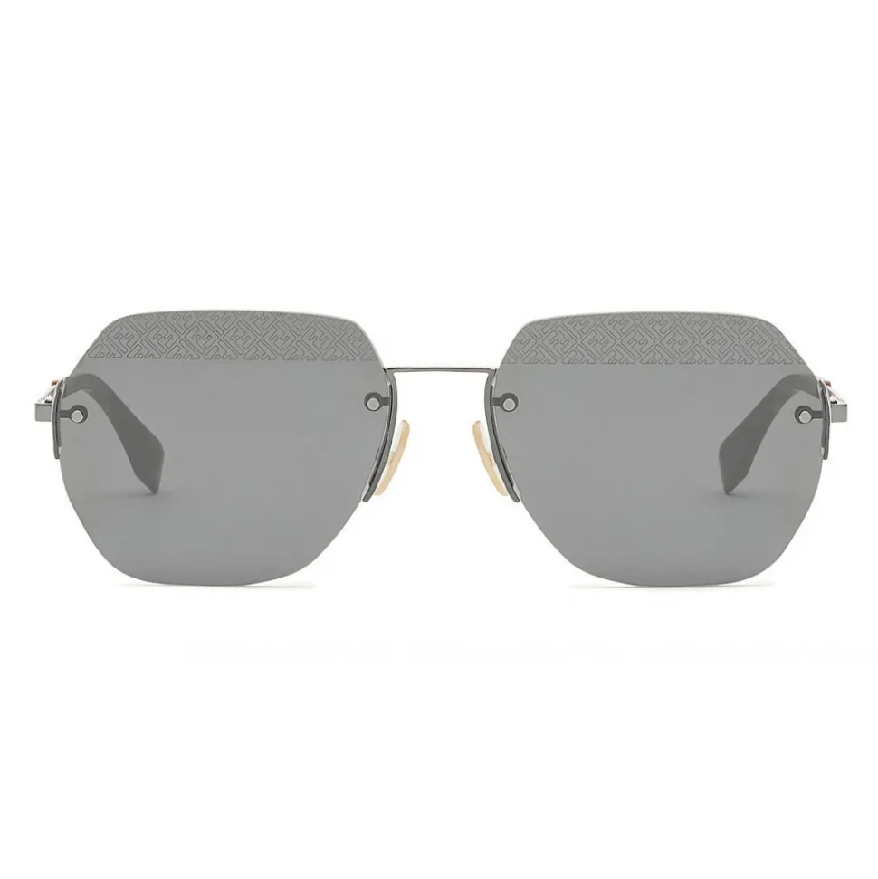 FF sunglasses characterized by a rimless construction with a minimal and ultralight rectangular cut. The lenses are decorated with a laser engraved FF motif on the top. The design is completed by a straight bridge, adjustable nose pads and metal rods with black ruthenium finish. Silver mirrored lenses. Made in Italy.