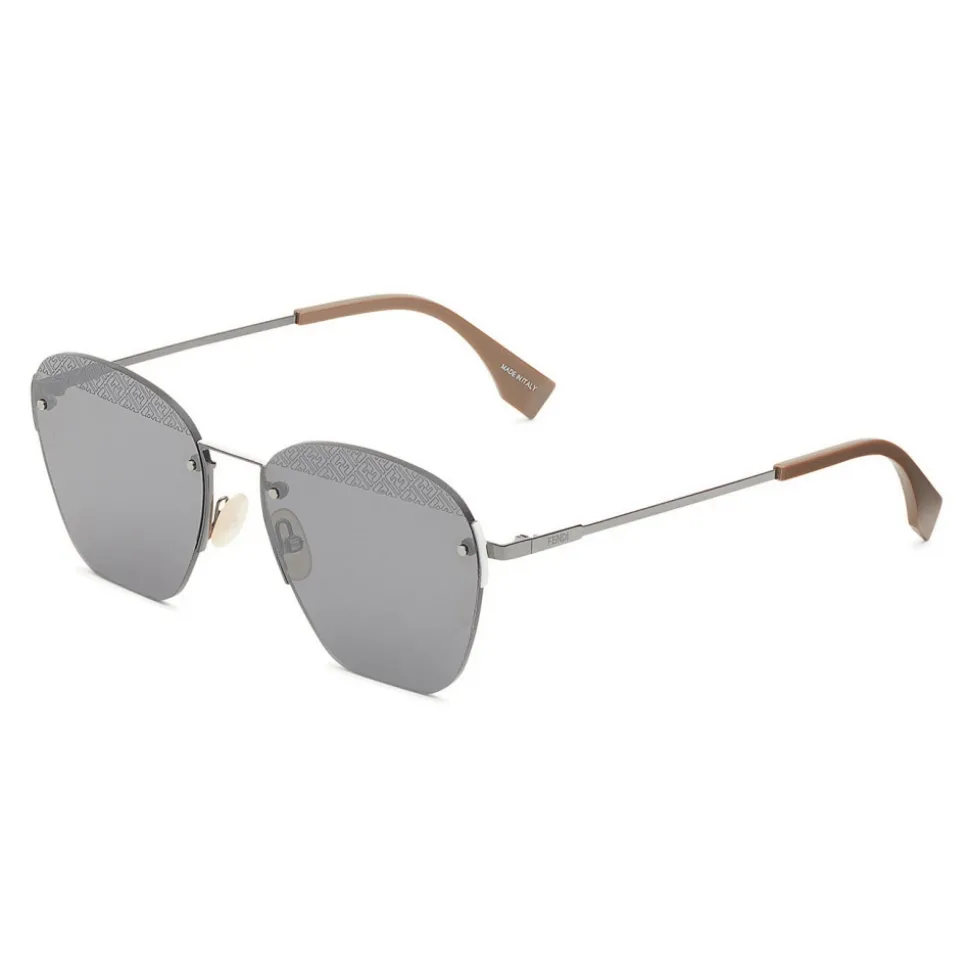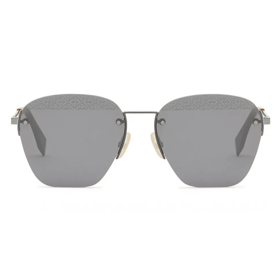 FF sunglasses characterized by a rimless construction with a minimal and ultralight square cut. The lenses are decorated with a laser engraved FF motif on the top. The design is completed by a straight bridge, adjustable nose pads and metal rods with black ruthenium finish. Silver mirrored lenses. Made in Italy.