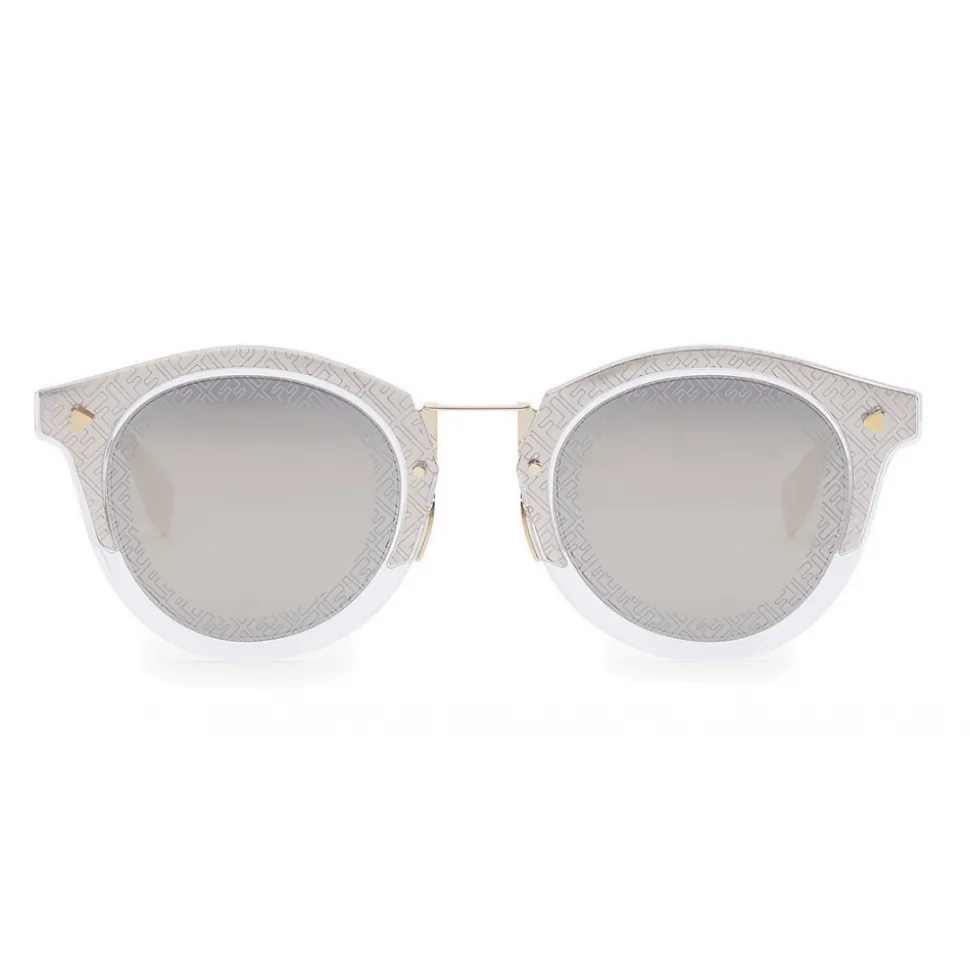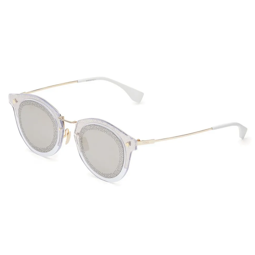 Round-shaped FF sunglasses with transparent optyl front and gold-plated metal temples. The sophisticated and light lines of the model are personalized with the iconic FF motif, engraved on the edge of the lenses and on the metal half circle. Complete with triangular rivets, adjustable nose pads and contrasting terminals. Gray-ivory lenses. Made in Italy.