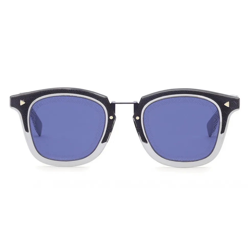 FF sunglasses with a square shape, with a transparent gray optyl front and gold-plated metal temples. The sophisticated and light lines of the model are personalized with the iconic FF motif, engraved on the edge of the lenses and on the metal half circle. Complete with triangular rivets, adjustable nose pads and contrasting terminals. Blue lenses. Made in Italy.