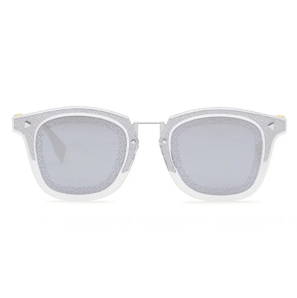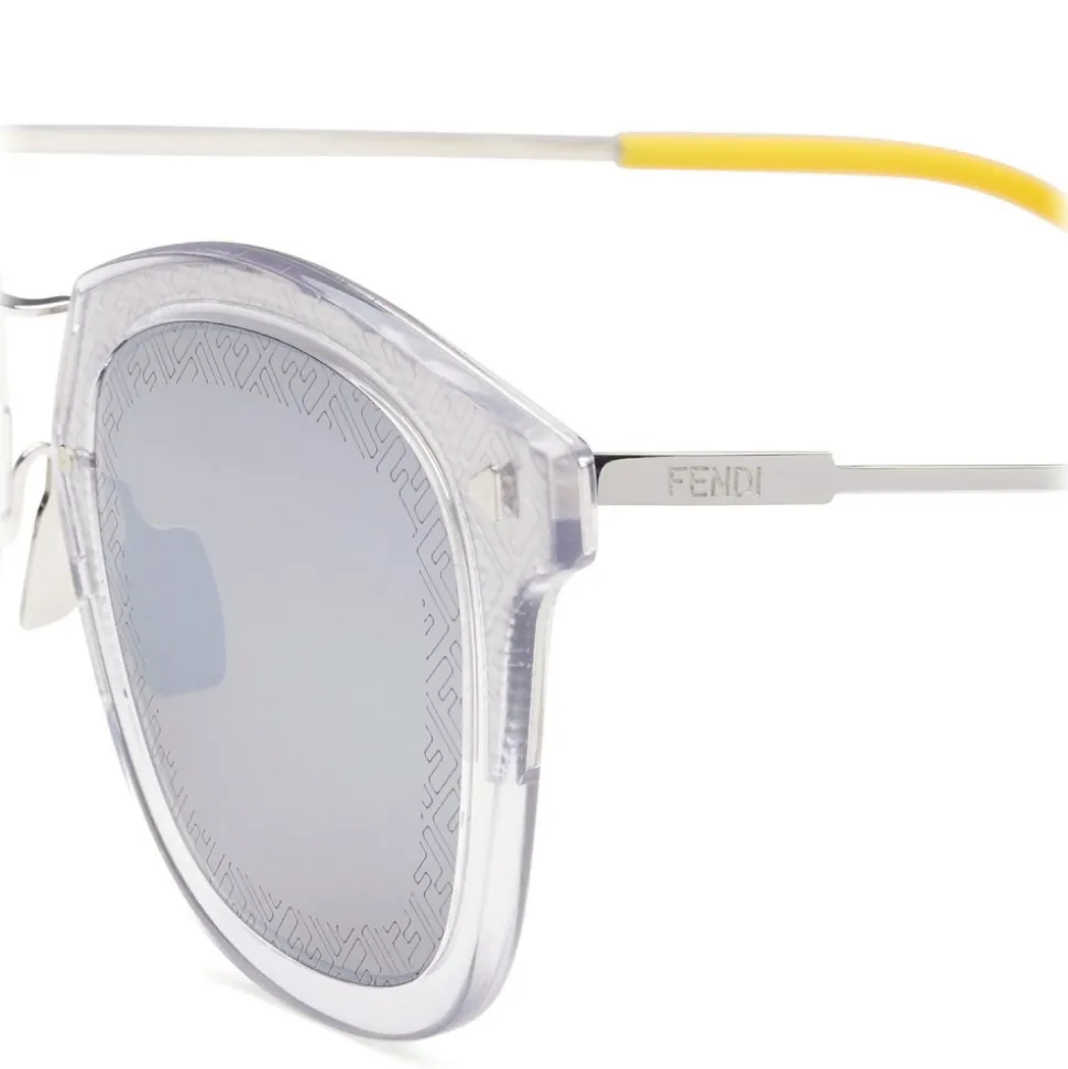FF sunglasses with square shape, with transparent optyl front and palladium finish metal temples. The sophisticated and light lines of the model are personalized with the iconic FF motif, engraved on the edge of the lenses and on the metal half circle. Complete with triangular rivets, adjustable nose pads and contrasting terminals. Silver mirrored lenses. Made in Italy.