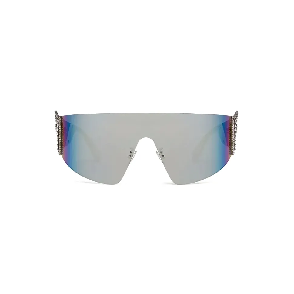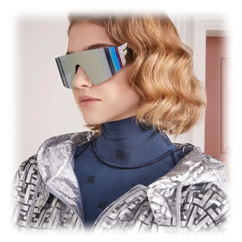 Sunglasses with an enveloping mask shape, decorated with FFreedom logo which recalls the decoration used in Fashion Jewelry. The single, gradient gray lens frame with mirror-effect is finished with white optyl tips. Made in Italy.
