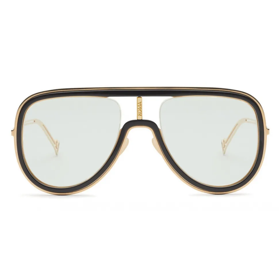 Fendi Futuristic sunglasses characterized by a refined mask construction. The front is made of black injected and gold-finished metal. Metal cylinder on the bridge engraved with Roma / Amor lettering and metal temples with F-shaped terminal. Adjustable nose pads. Transparent lenses. Made in Italy.
