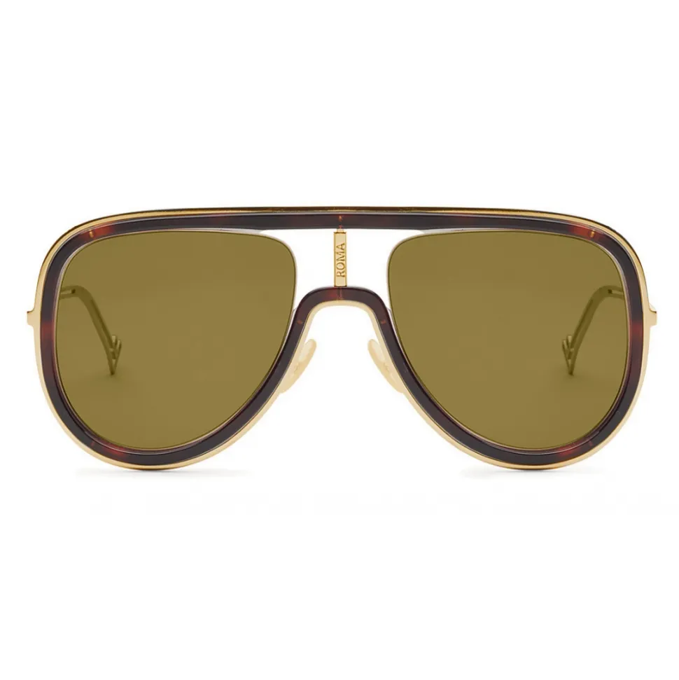 Futuristic Fendi sunglasses characterized by a refined mask construction. The front is made of injected havana and gold-finished metal. Metal cylinder on the bridge engraved with Roma / Amor lettering and metal temples with F-shaped terminal. Adjustable nose pads. Brown lenses. Made in Italy.