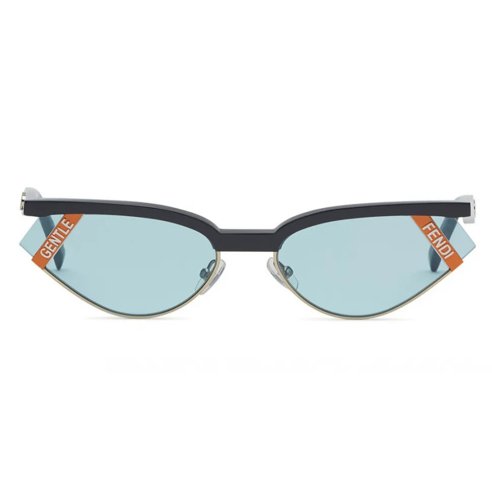 Gentle Fendi sunglasses with a small cat eye shape, created in collaboration with Gentle Monster. The geometric lines and the orange plate with contrasting Fendi lettering on the lens define a contemporary and striking silhouette. The frame is made of a mix of materials, with an upper arch in gray acetate and a lower edge in gold-colored metal. The auctions are personalized with the Gentle Monster logo and the signature of the laser-printed collaboration inside. Adjustable nose pads. Blue lenses. Made in Italy.
