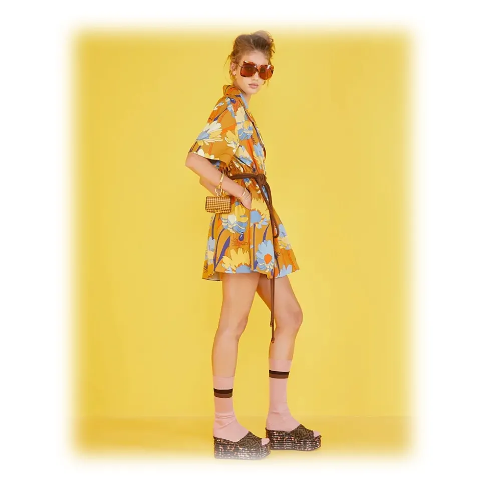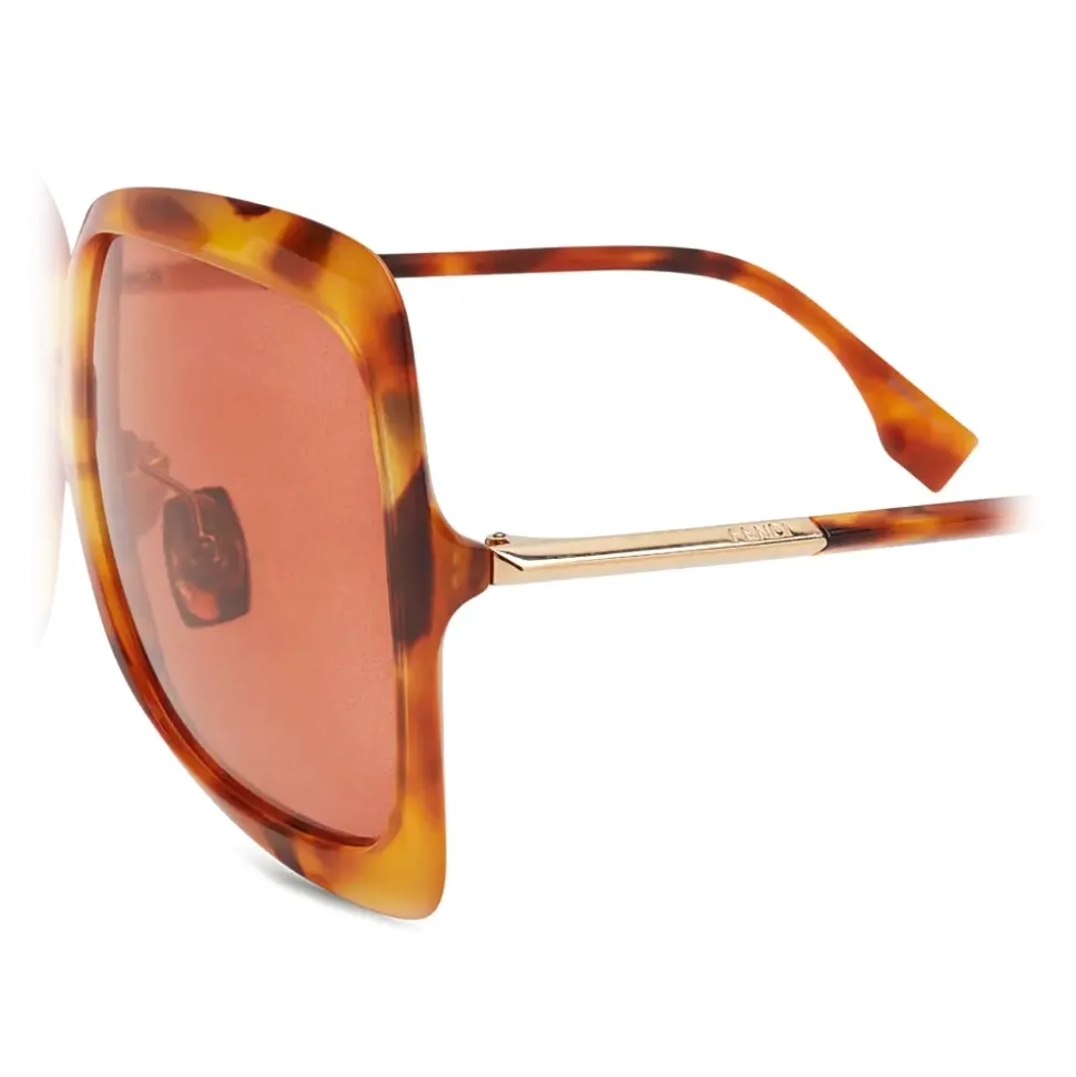 Presented at the Spring/Summer fashion show, these sunglasses are distinguished by their oversize square shape with ’70s-inspired spherical lenses and are made of acetate in tones of Havana brown. Finished with gold-colored temples, triangular section and acetate tips. Dark cherry pink lenses and adjustable nose pads customized with the FF logo. Made in Italy.