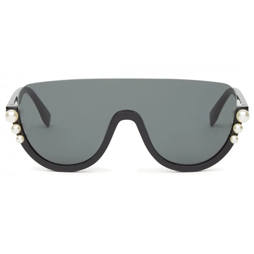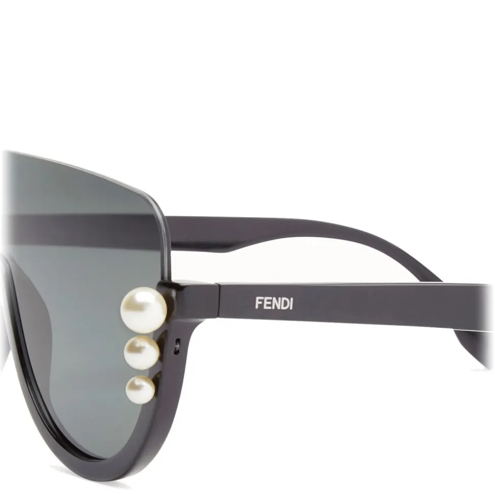 Ribbons and Pearls sunglasses in black acetate, with a mask lens with a sporty-chic appeal. The Swarovski pearls applied on the front in three different sizes embellish the design. Auctions with engraved Fendi logo. Gray lenses.
