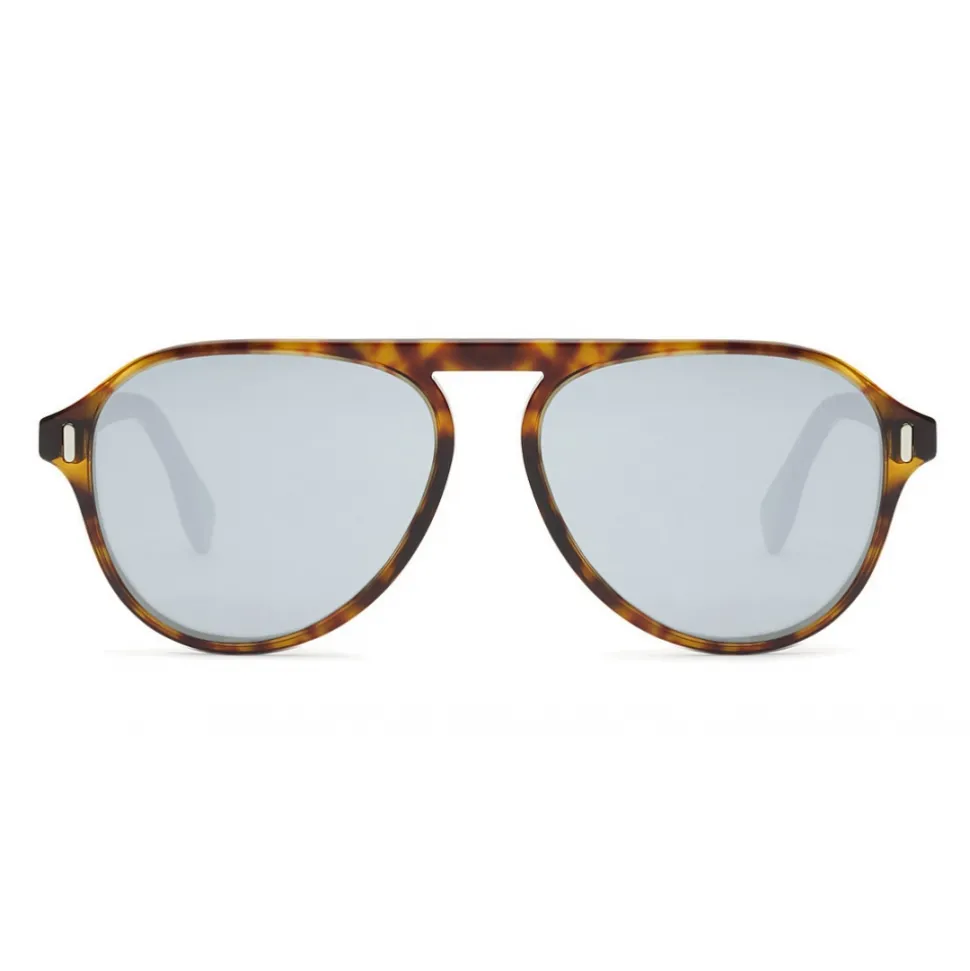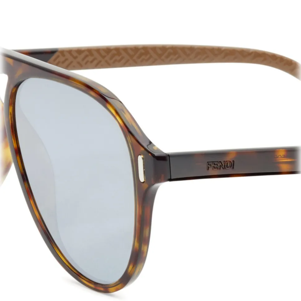 Fendi sunglasses with an urban and contemporary design featuring an aviator shape made of resistant, flat and ultra-light havana acetate. Beige contrasting temples decorated on the inside with laser-printed FF motif and on the terminal with the iconic Bag Bugs GREEN fluorescent eyes. Silver mirrored lenses. Made in Italy.