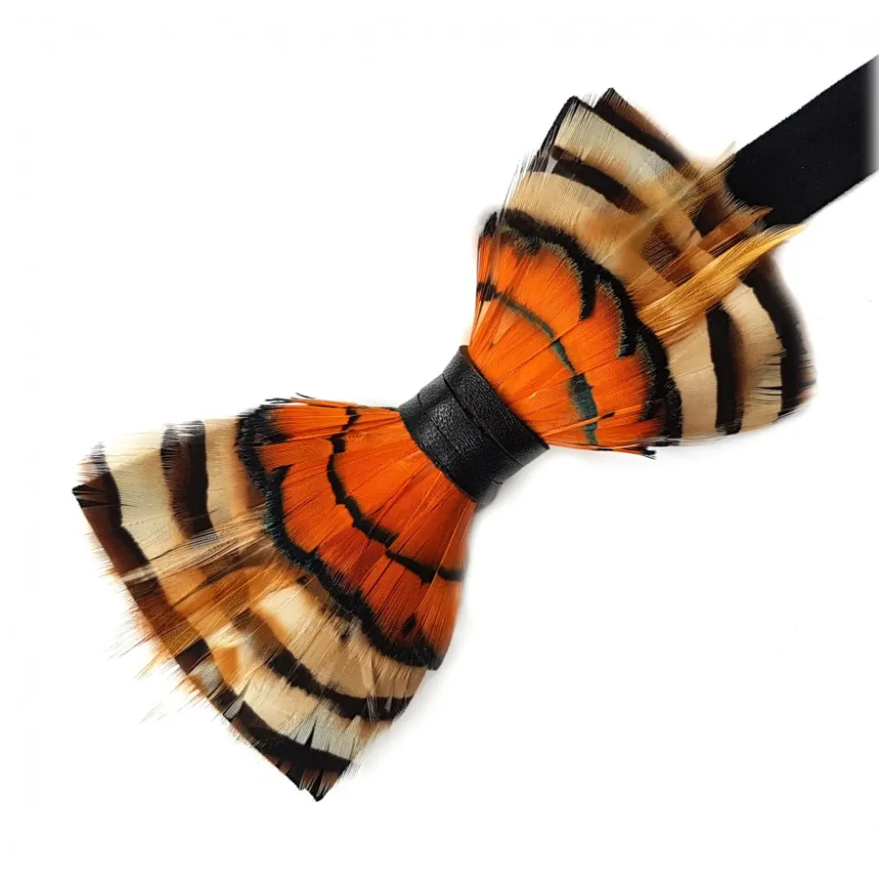 Black suede bowtie with Natural Partridge Hen, Brown Chinchilla Rooster and Orange Golden Pheasant Tippet feathers.